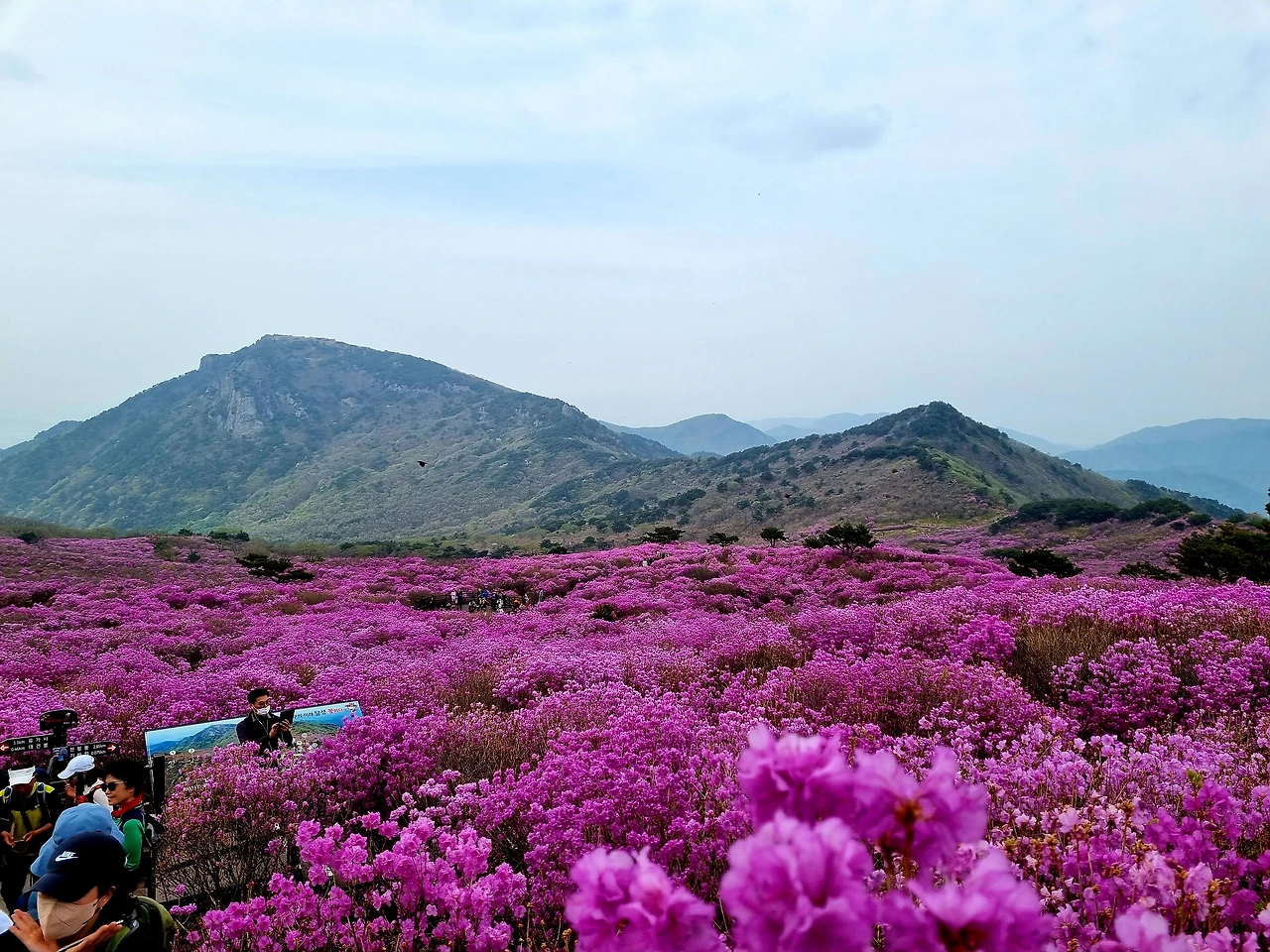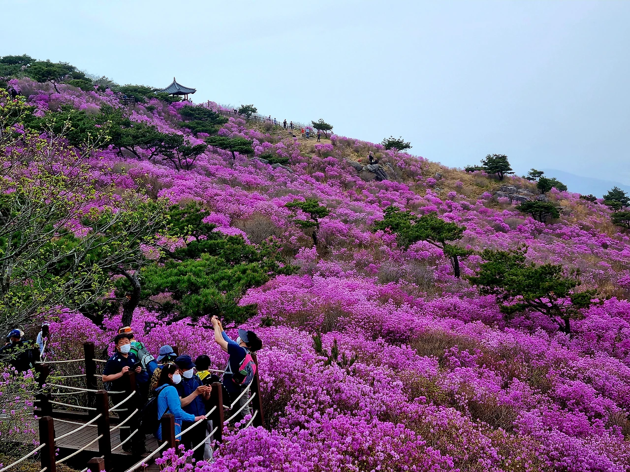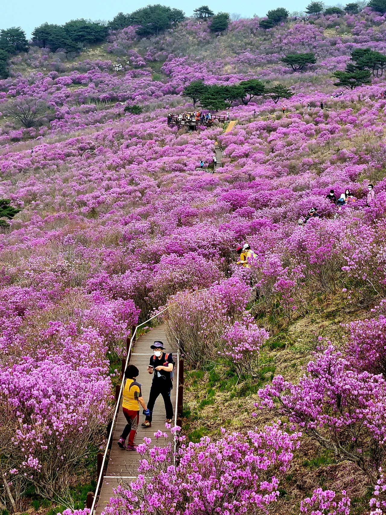 참꽃 군락지 데크길을 걷는 산객들국화(國花) 논쟁이 있을 때마다 후보로 거론되는 꽃, 한반도 어디서나 볼 수 있고 우리 정서와도 잘 어울리는 진달래 꽂이 너무 좋다.