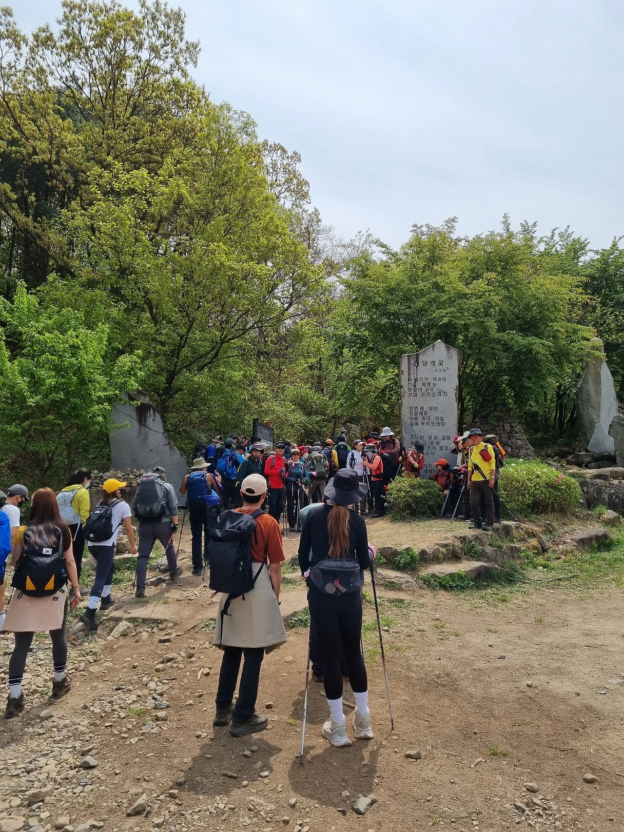 진달래꽃 시비를 돌아 들며 산정으로 향하는 인파에 휩쓸린다. 등산로는 6.25 때 중공군이 인해전술로 고지를 향해 밀어붙이는 듯한 모습니다. 배낭을 하나씩 짊어진 산객들이 총 대신 등산 스틱을 힘차게 찍으며 한 걸음 더 오르려 힘을 쓰고 있다. 팍팍한 흙먼지가 인절미에 얹힌 고운 콩가루처럼 등산화에 소복이 쌓이지만, 물 한 모금 마실 여유 없이 산객들 무리 속에 뒤 썩여 산정으로 계속 떠밀려간다.
