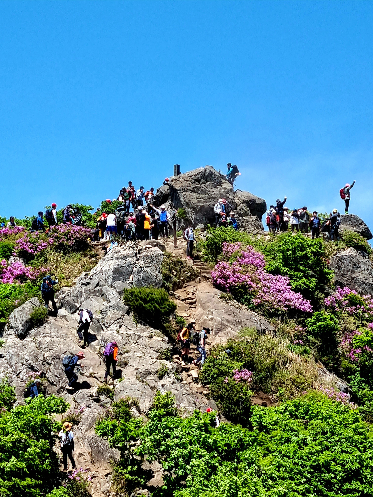 아래쪽으로 한달음 내려와 건너편 봉우리에 올라서니, 정상 바위 주변에 핀 철쭉꽃과 바위를 오르는 산객들이 어우러져 특별한 모습을 보여 준다.
