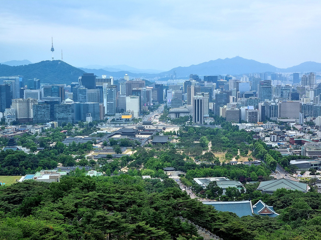 정자를 뒤로하고 데크길 따라가니, 이내 전망대에 이른다. 경복궁이 발아래로 내려다 보이고, 광화문과 남산까지 일직선으로 보이는 경치가 일품이다. 청와대 건물은 산 아래 바짝 붙어 있는 탓에 지붕만 살짝 보이는 것은 아쉬운 모습이다.