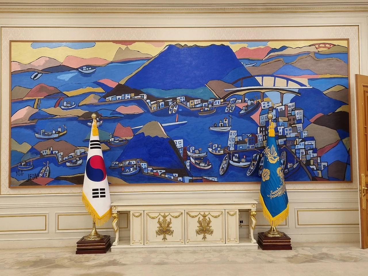 중앙 로비 전영림 화백의 통영항 작품과 역대 영부인 초상화 관람코스는 임명장 수여식 장면으로 낯설지 않은 충무실과 서양식으로 꾸며진 인왕실을 돌아 2층에 위치한 대통령 집무실로 이어진다.