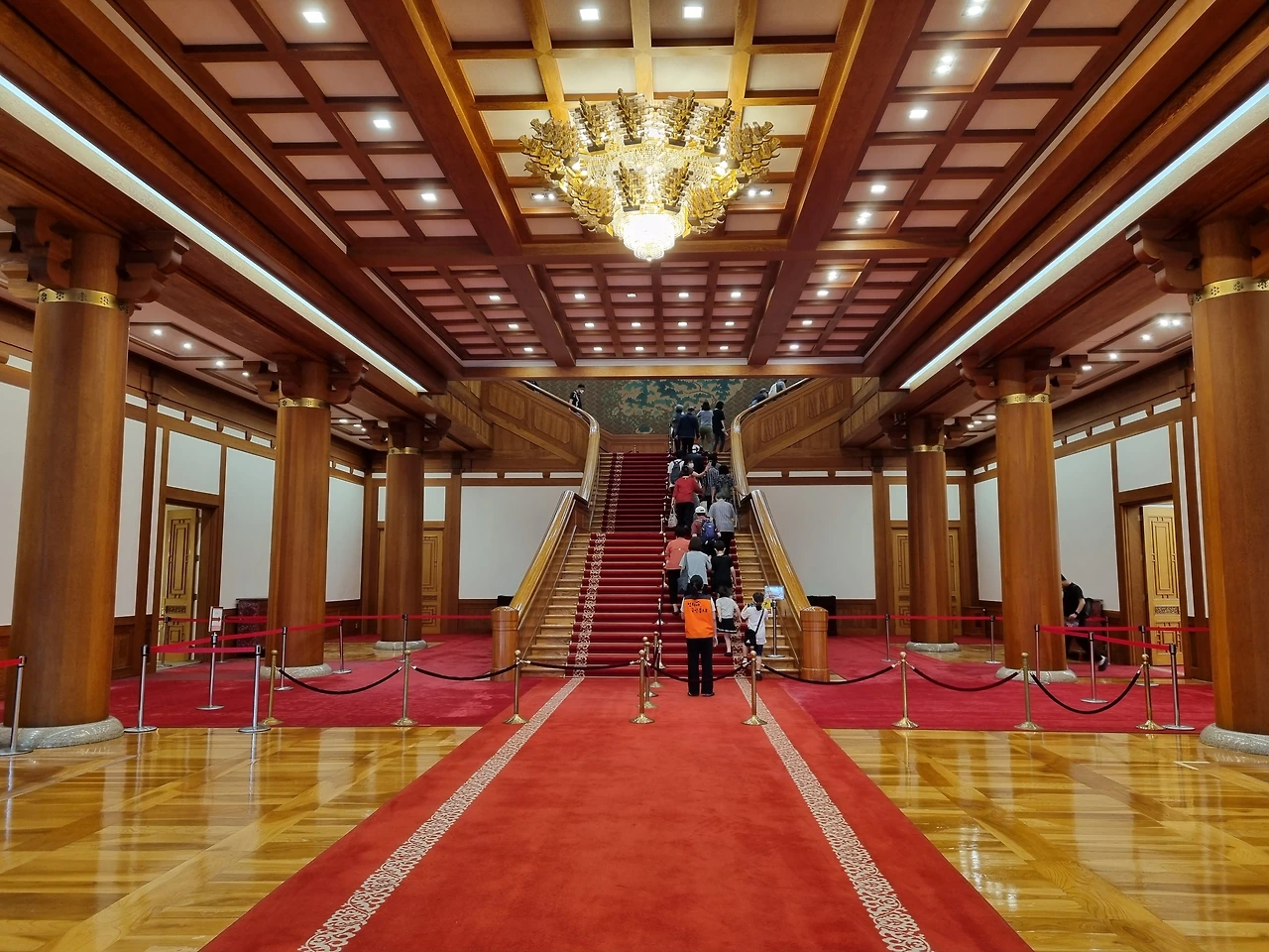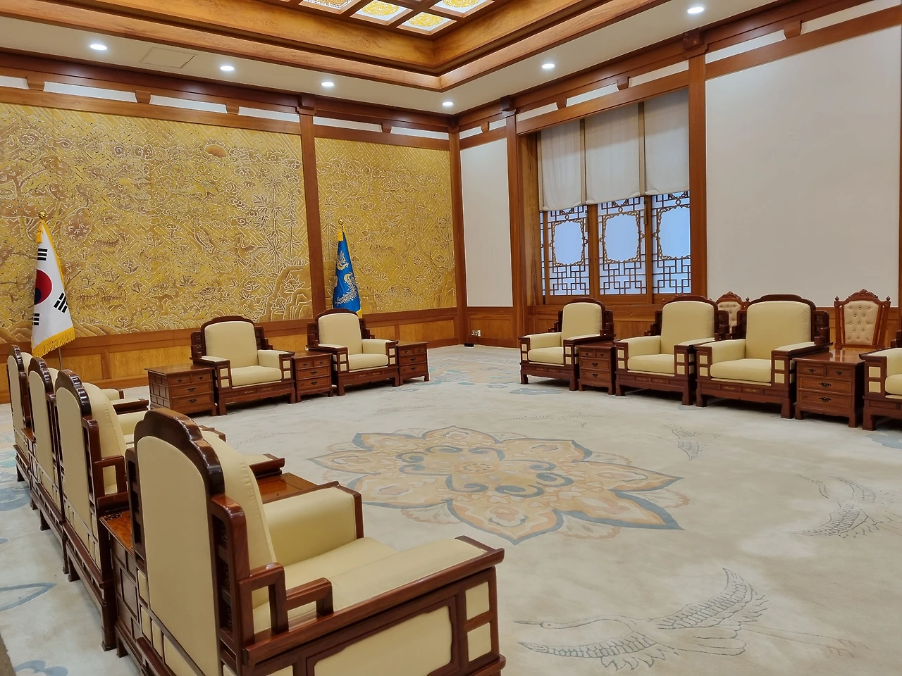격자무늬와 나무기둥으로 한국적 미를 잘 살렸지만, 붉은색 카펫은 명·청 시대 황제가 살았을만한 중국풍 분위기를 느끼게 한다.