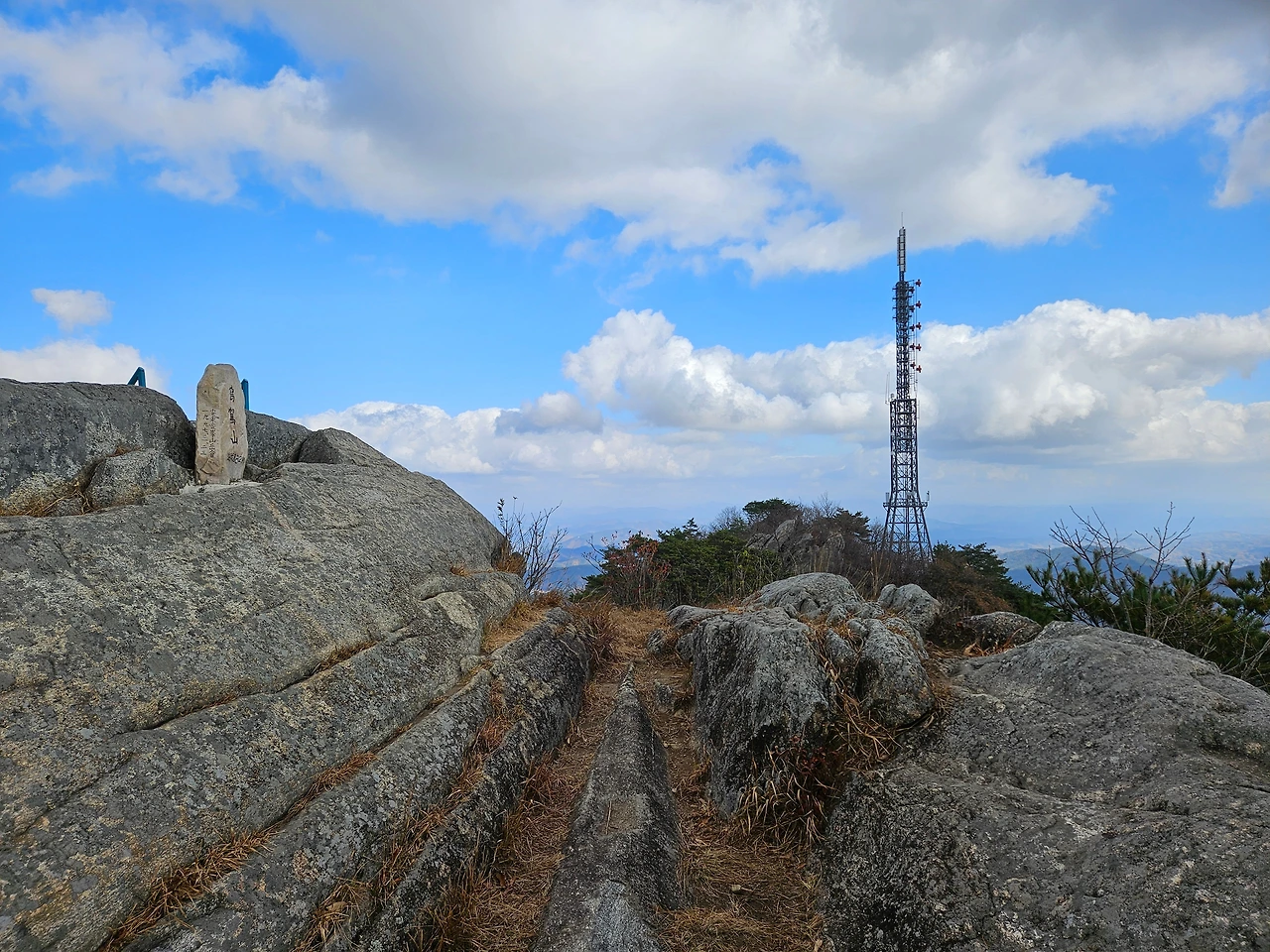 마침내 시루떡처럼 뭉툭하게 솟은 바위가 눈앞에 나타난다. 여기가 국사봉 정상.