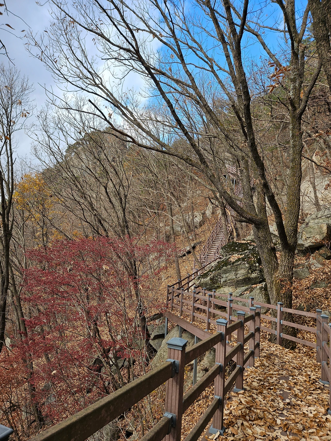 바위에 녹색 철계단이 놓여있지만, 안전이나 미관은 고려하지 않은 듯 어설프게 걸쳐져 있다.