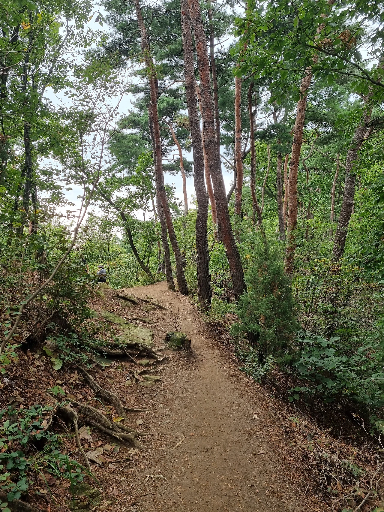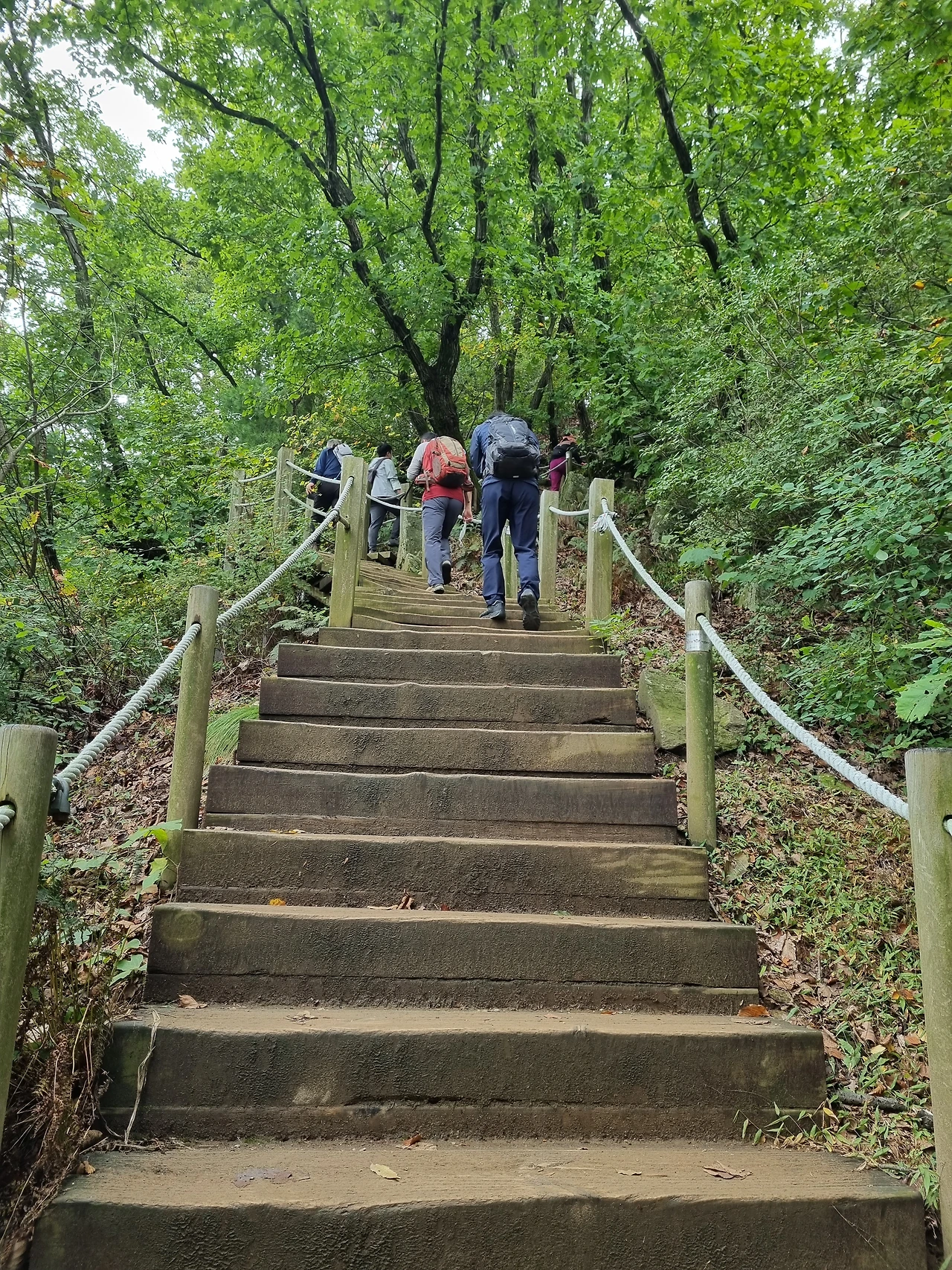 청계사와 석기봉으로 갈라지는 삼거리에서 오른쪽 으로 내려가니, 소나무 숲길 따라 오르막 계단으로 이어진다.