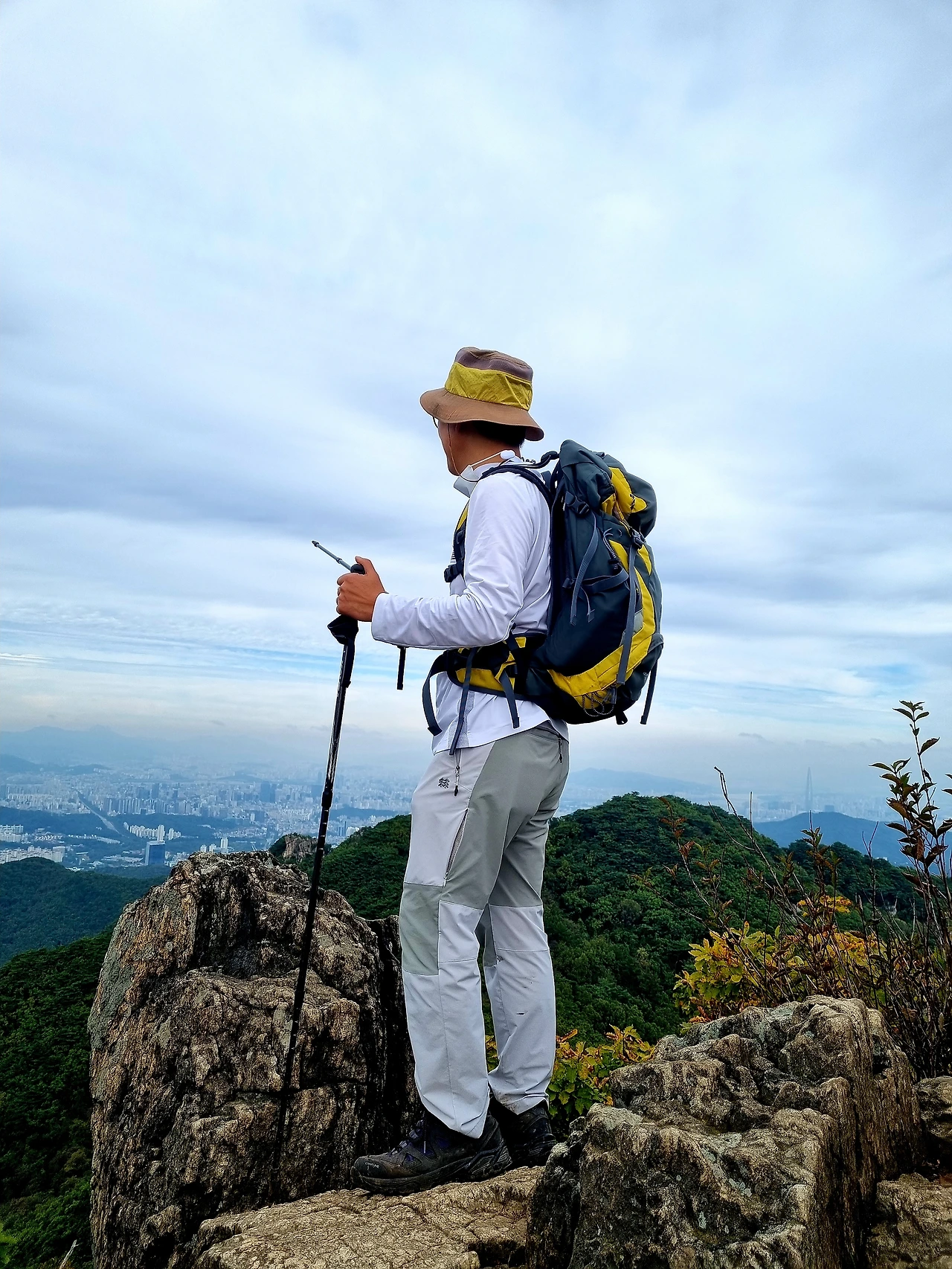 꼭대기에 올라서니 지나온 능선과 이수봉이 한눈에 들어오고, 아파트로 뒤덮인 도시가 보인다.