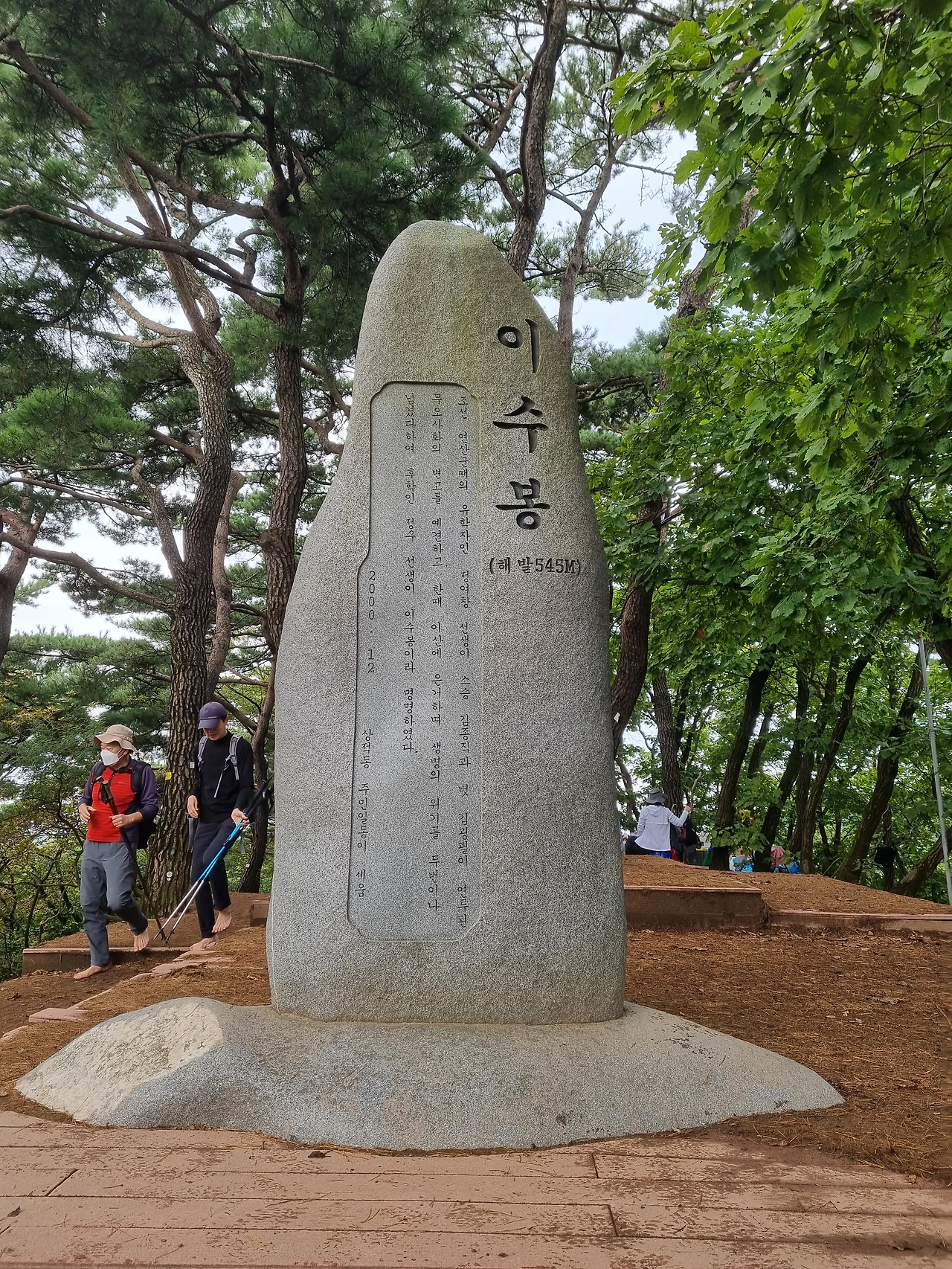 한 시간 여를 올라 이수봉에 도착한다. 해발 545M 이수봉을 알리는 큰 돌비석이 서 있고, 무오사화(戊午史禍)에 연루되었던 정여창이 이곳에 숨어 위기를 두 번이나 모면하여 붙여진 이름이란 글귀가 새겨져 있다.