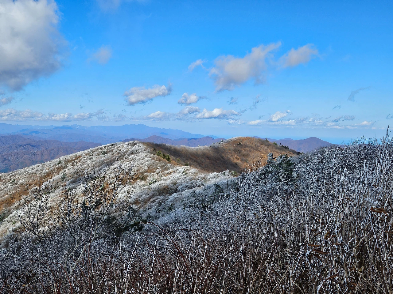 쉬어 가기를 몇 번 반복하고 드디어 비로봉 정상에 도달한다. 1563m로, 오대산에서 가장 높은 곳이다. 나뭇가지에 내려앉은 눈은 상고대처럼 하얗고, 마치 설탕을 잔뜩 뿌려 놓은 것처럼 보인다. "저 아래는 단풍 구경, 여기서는 눈 구경을 하는구나..."
