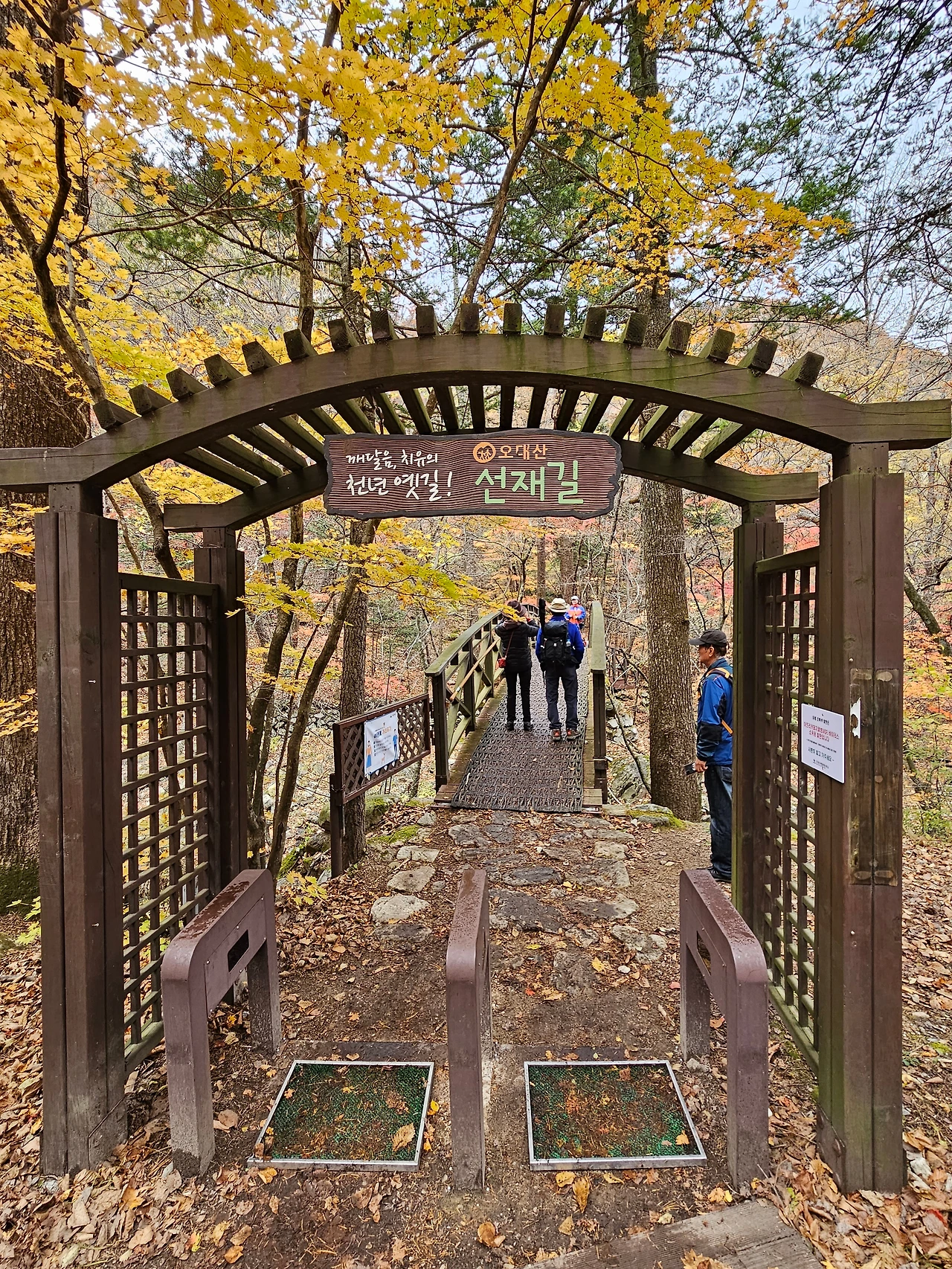 관대걸이절을 돌아 나와 본격적인 산행을 시작하고, 한참을 더 오르니 중대사자암 기와지붕 위로 곱게 물든 단풍이 아름답게 펼쳐진다. 경사진 곳에 세운 특색 있는 사찰은 이곳을 지나는 산객들의 발길을 잠시 멈추게 만든다. 사찰 옆으로 난 돌계단을 따라 또 오른다. 계단을 따라 설치된 스피커에서 은은하게 불경 외는 소리가 들려온다. 산길을 따라 석등처럼 설치된 특이한 스피커는 적멸보궁까지 이어진다.