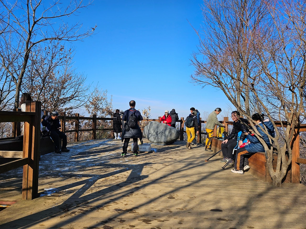 능선 따라 퍽퍽한 산길을 걸으니, 나무아래 자작하게 쌓인 눈에서 불어오는 찬 바람이 목덜미로 파고든다. 모자를 꾹 눌러쓰고 종종걸음 치니, 가파른 나무계단 앞에 이른다. 정상까지 가자면 두 번 의 가파른 언덕을 넘어야 하는데, 첫 번째 언덕이 바로 여기다. 발걸음마다 허벅지가 땡기고 숨이 가빠지는 구간이다.