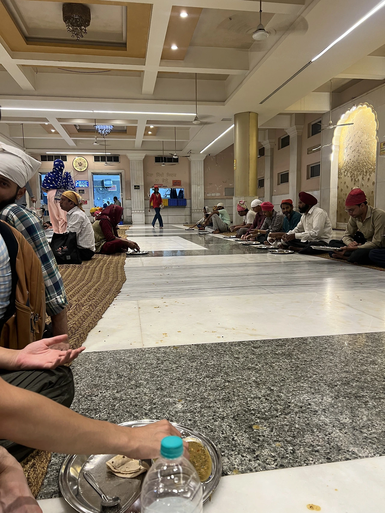 빠니보틀 형님 영상에서 본 그대로 거대한 사원에서 단체 급식을 먹고 있었다. 식판을 하나씩 쥐고 바닥에 앉아 있으면 봉사자들이 직접 와서 콩으로 만든 달과 난을 함께 주었다. 먹고 싶은 만큼 먹을 수 있는 구조로 보였다. 빈자들은 생각보다 많지 않고. 깔끔한 사람들과 시크교도들이 섞여서 받을 먹고 있었다.