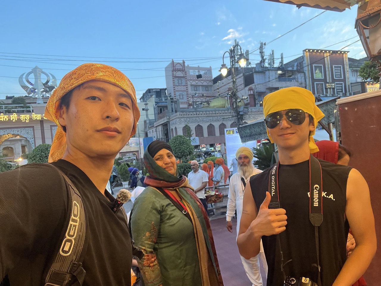 사실 될 거라고 생각하고 간 건 아닌데, 사원 앞에서 쿠키를 나눠주고 있는 시크교도 성직자? 들에게 말을 건넸고 그들이 안내해 주며 일이 술술 풀렸다. 시크교 사원에 들어가기 위해서는 신발을 벗고 머리를 가려야 하는데. 머리를 가릴 손수건을 우리에게 둘러주고 사원으로 안내했다.