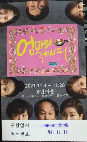 사흘 전 G오페라 안 단장으로부터 11/19일 금요일 저녁에 김 작가쌤과 셋이 대학로에 연극을 보러 가자는 연락이 왔다. 늦가을 밤에 연극을 보는 즐거운 일이 갑자기 찾아왔다. 볼 연극은 '공간 아울'의 <엄마의 레시피>. 코로나 이후 죽은 거리가 싫어서 일 년 간 발길을 끊었던 대학로에서... 예상 밖 연극 관람에 기대와 즐거움이 솟아난다.