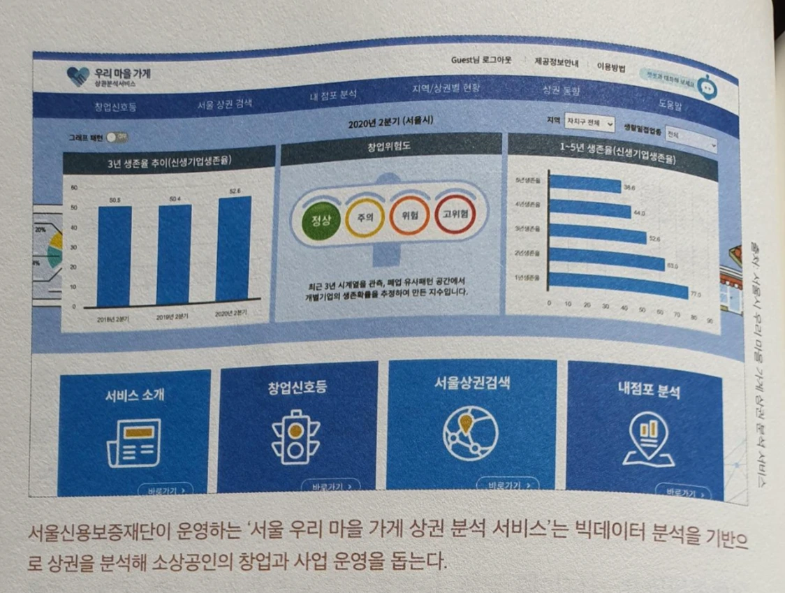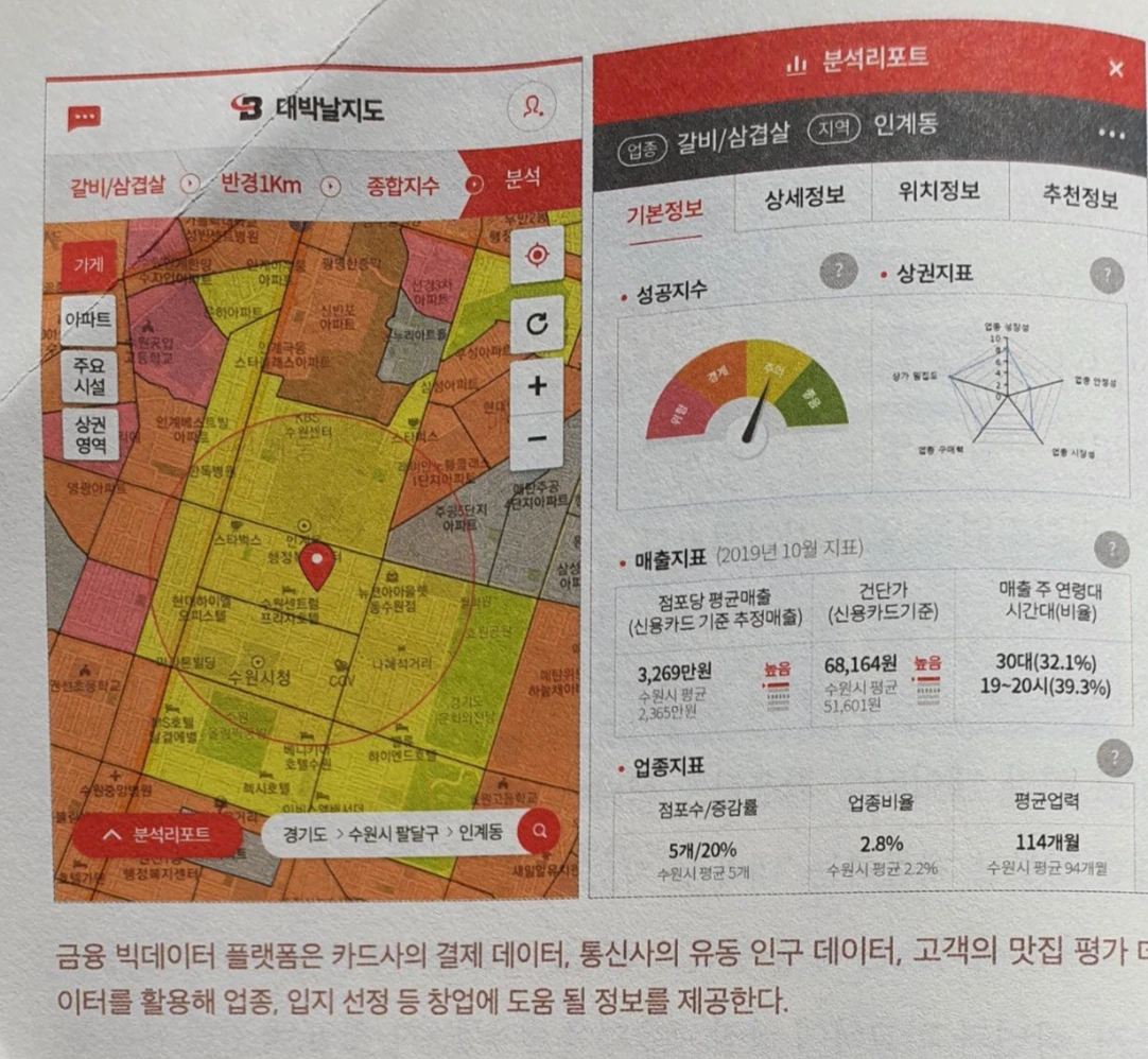 BC카드의 금융 빅데이터 플랫폼은 카드사의 결제 데이터 통신사 유동 인구 데이터 맛집 빅데이터 플랫폼 이용 고객들의 맛집 평가 데이터를 활용하여 어디에 어떤 업종을 창업하면 좋을지에 대한 정보를 제공하는 '대박 날 지도' 서비스를 제공한다. '대박 날 지도' 서비스는 특정 상권의 월평균 매출액이 주변 상권 매출보다 높은지, 작년과 비교하여 상점 매출이 증가했는지, 상권 내 경쟁 상황 등 시장성, 안정성 관점에서 종합적으로 분석한 창업 지수를 시각화하여 지도 위에 색상으로 표현한다.