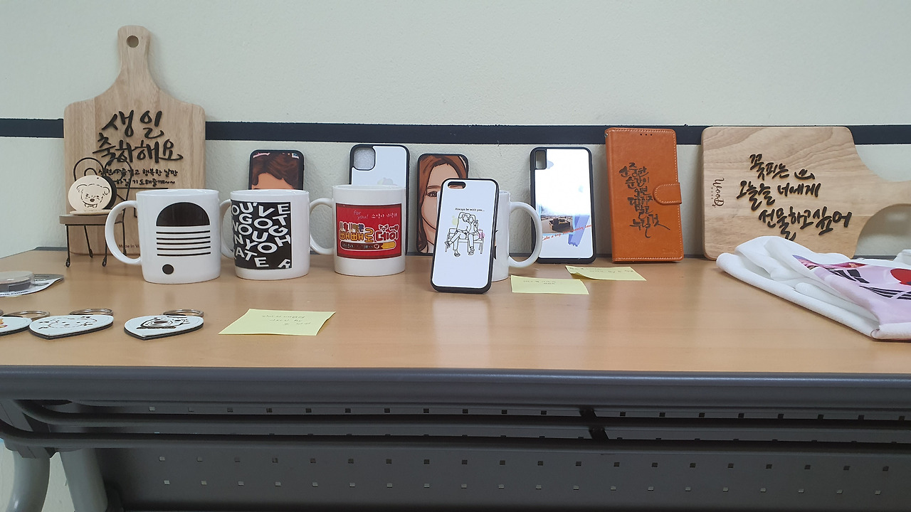 몇몇은 적극적이다. 내 생각엔 약 3개월 정도는 포토샵과 일러스트를 집중해 배운다. 완전 초보를 면하면 두 가지 프로그램을 이용해서 머그컵·티셔츠 ·휴대폰 케이스에 인쇄할 그림을 디자인하고, 로고도 개발새발 그리며디자인 전사지(특수 프린트 용지)를 제품에 프린팅하면 좋을 텐데....... 너무 서두르지 않길 바랐다.