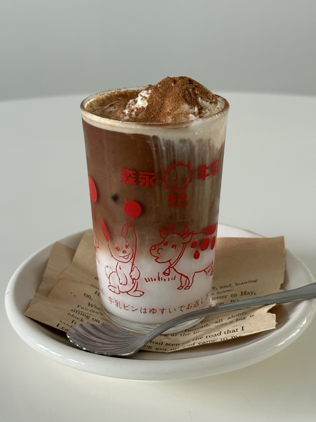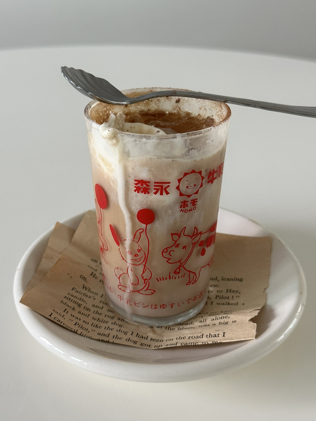 그 위에 진하게 내린 커피를 넣고 바닐라맛 아이스크림을 소북이 올린다. (보통 나는 오트밀크 약 100밀리그램에 네스프레소 중간버튼을 눌러 추출한다. 만약 집에 커피머신이 없다면 카누를 물 40밀리그램에 섞어 만들어도 좋다.)