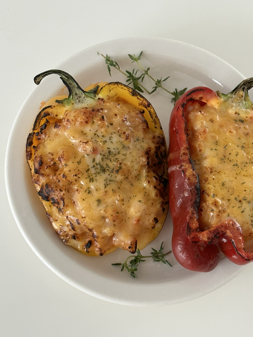 파프리카 속을 발라 그 안에 밥을 채워준 뒤 사두었던 슈레드 치즈를 수북이 올려주었다.