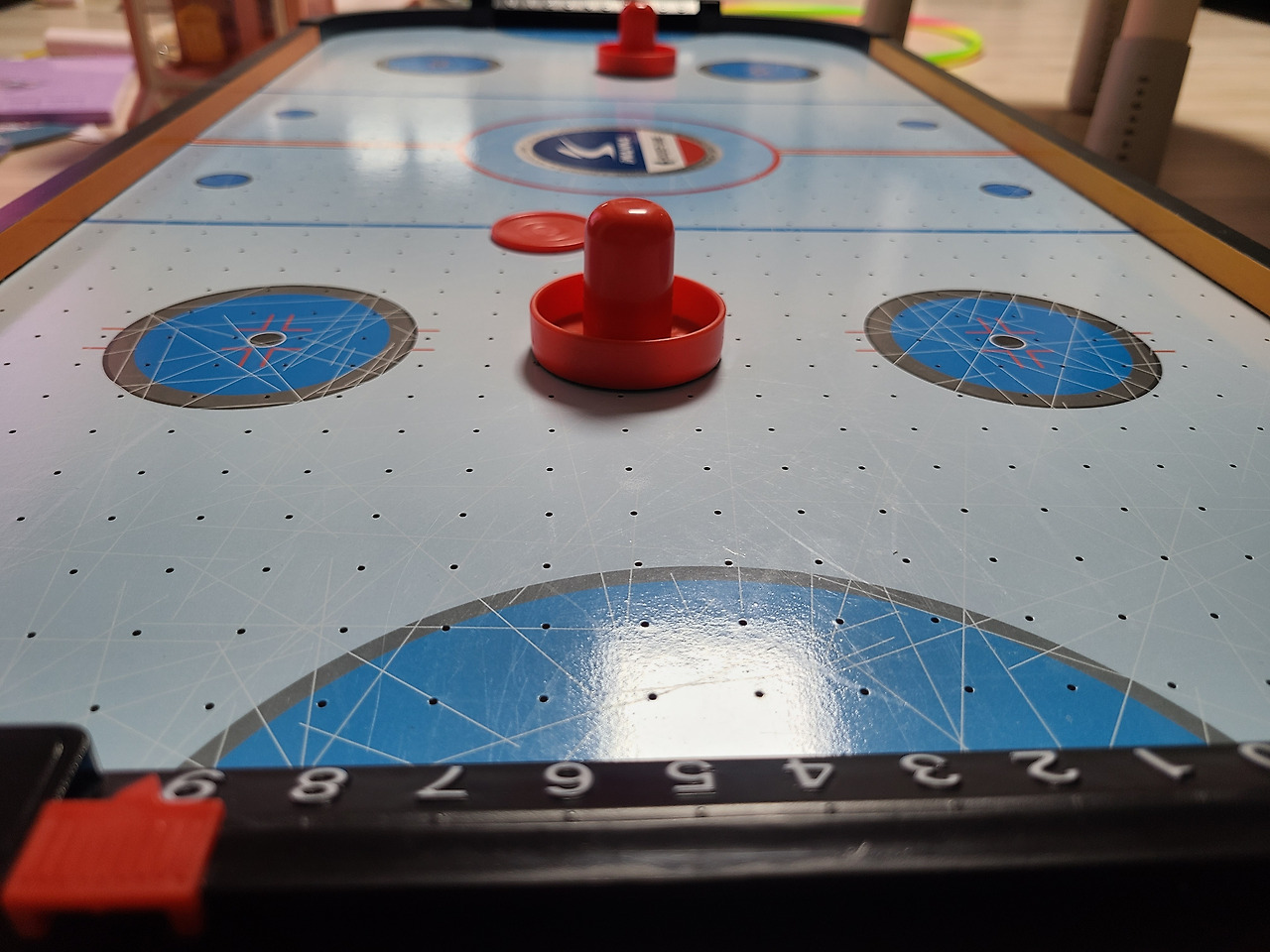 유나는 사촌과 미니 에어하키 게임을 했다. 아이들은 퍽이 들어갈 때마다 소리를 질렀다. 둘은 서로 이기기 위해 열심히 했다. 아이들이 하기에는 재밌는 놀이다.