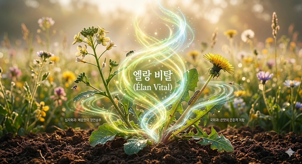 십자화과의 매운맛도, 국화과의 쓴맛도 결국은 정지된 물질에 머물지 않고 끊임없이 창조적 진화를 이어가려는 생명 에너지의 분출입니다. 그들은 포식자라는 저항벽 앞에서도 굴복하지 않고, 오히려 그 위협을 자신만의 독특한 향기와 맛으로 변주해 내며 생명의 도약을 완수합니다.