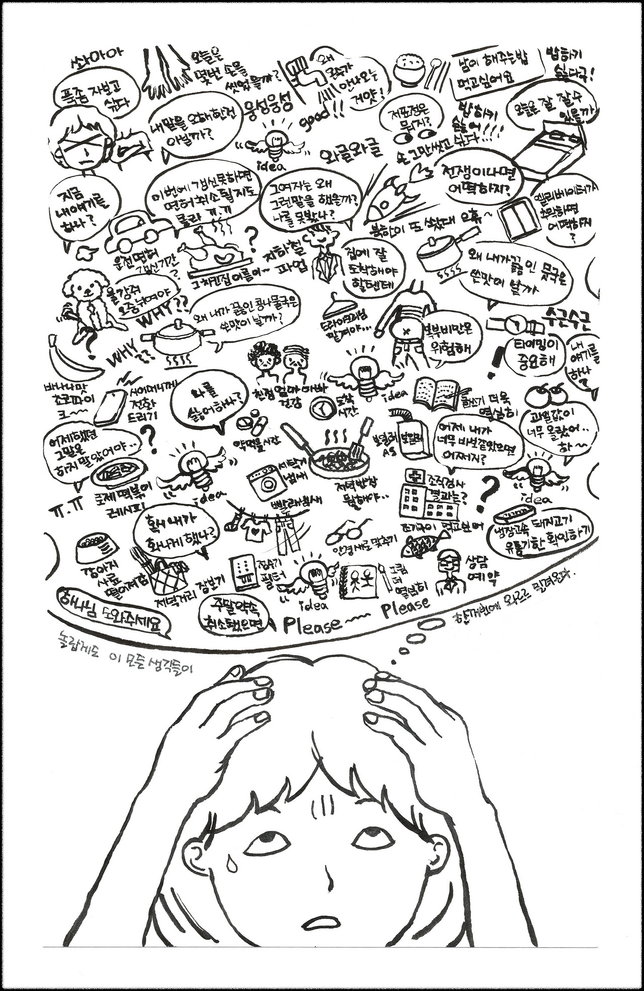 그런 내가 15년전 직장생활을 그만둔 이후로 집에서 할수있는 일이라고는 낙서밖에 없었다. 빨래와 청소, 식사준비를 하며 틈틈히 나의 마음과 상황을 낙서와 글로 옮겼다. 꽤나 부지런을 떨었다. 말하자면, 유튜브 같은데에서 정신과 의사들이 불안한 사람들에게 권하는 ‘감정일기’를 나는 그림일기의 형식으로 이미 실천하고 있었던 셈이다. 감정일기의 필요성에 대한 지식을 갖게되기 훠얼씬 전의 일이다. 기특하게도 내가 나의 정신건강을 위해 나 스스로 살길을 찾아내 걸어가고 있었던 셈이다. 놀라워라. 나자신이여. 생존본능이란게 이렇게 무섭다.