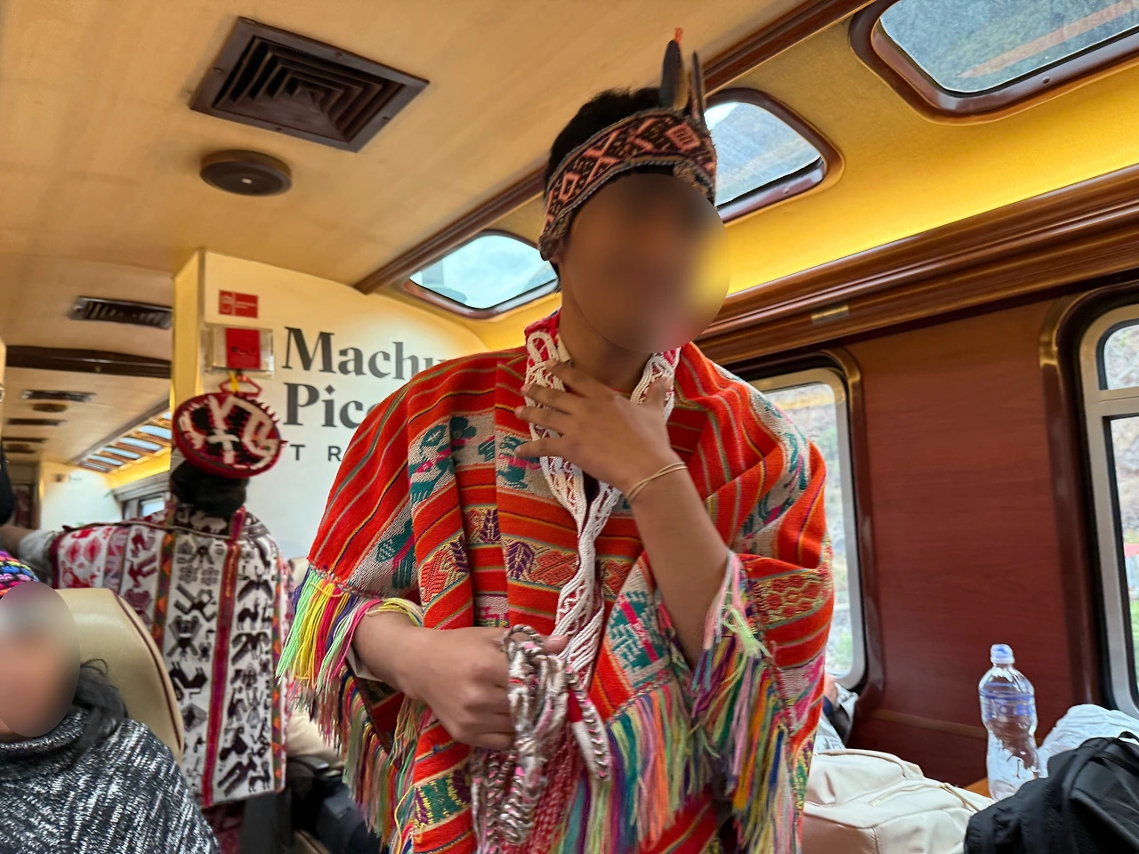 기차가 출발하고 나면 잉카인의 사랑을 주제로 한 공연이 펼쳐진다. 잉카레일 기차에는 각 호차 별로 담당 승무원들이 있는데, 이 승무원들이 전통 의상을 입고 공연을 한다. 여행을 오기 전에 잉카레일 기차에서는 공연이 있다는 건 알았었다. 하지만 승무원이 공연하는 줄은 몰랐다. 승무원이 공연을 마치고 잠시 현타가 온 거 같은 표정으로 판초를 벗는 것을 보았다. 고생이 많으십니다.