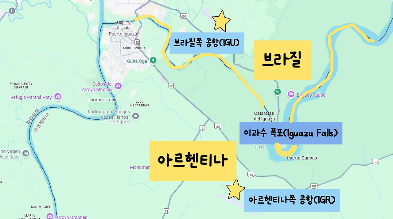 이과수 폭포는 브라질과 아르헨티나 국경에 위치해 있다. 위 사진처럼 노란색 국경선을 따라 두 나라가 나뉘고, 그 사이에 이과수 폭포가 있다. 그래서 아르헨티나와 브라질 어느 쪽에서든 모두 이과수 폭포를 볼 수 있고, 나라에 따라 볼 수 있는 풍경이 다르다. 아르헨티나 쪽 이과수 폭포는 3시간가량 트레킹을 하며 폭포 가까이에서 물줄기를 보고 느낄 수 있다. 브라질 쪽 이과수 폭포는 폭포의 전체적인 모습을 멀리서 한눈에 볼 수 있다. 트레킹 코스도 아르헨티나 보다 짧아 약 1시간이면 다 둘러볼 수 있다. 사진에서 보는 것처럼 브라질 쪽은 파란 부분의 이과수 폭포를 보는 것이고, 아르헨티나 쪽은 초록 부분의 이과수 폭포를 보는 것이다.