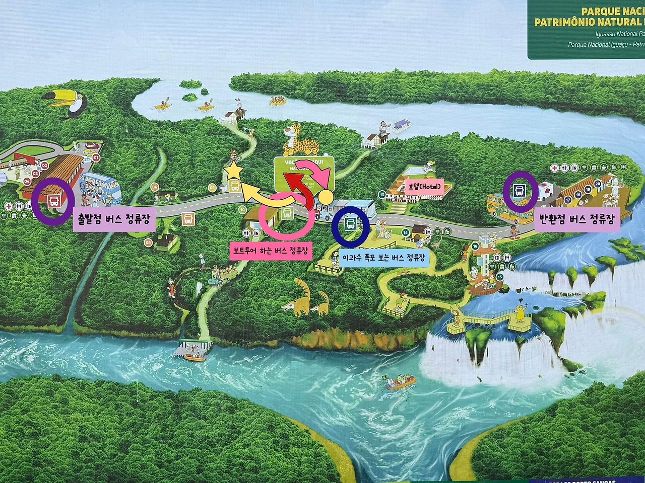 이쯤에서 돌아보는 나의 동선은 이러하다. 브라질 쪽 이과수 폭포는 버스가 출발하고 세 번째로 도착하는 버스 정류장에서 내리면 이과수 폭포를 볼 수 있다. 두 번째로 도착하는 버스 정류장은 보트투어를 할 때 내려야 하는 정류장이다. 이 사실을 미리 좀 알고 움직였으면 얼마나 좋았을까? 이 귀차니즘아.