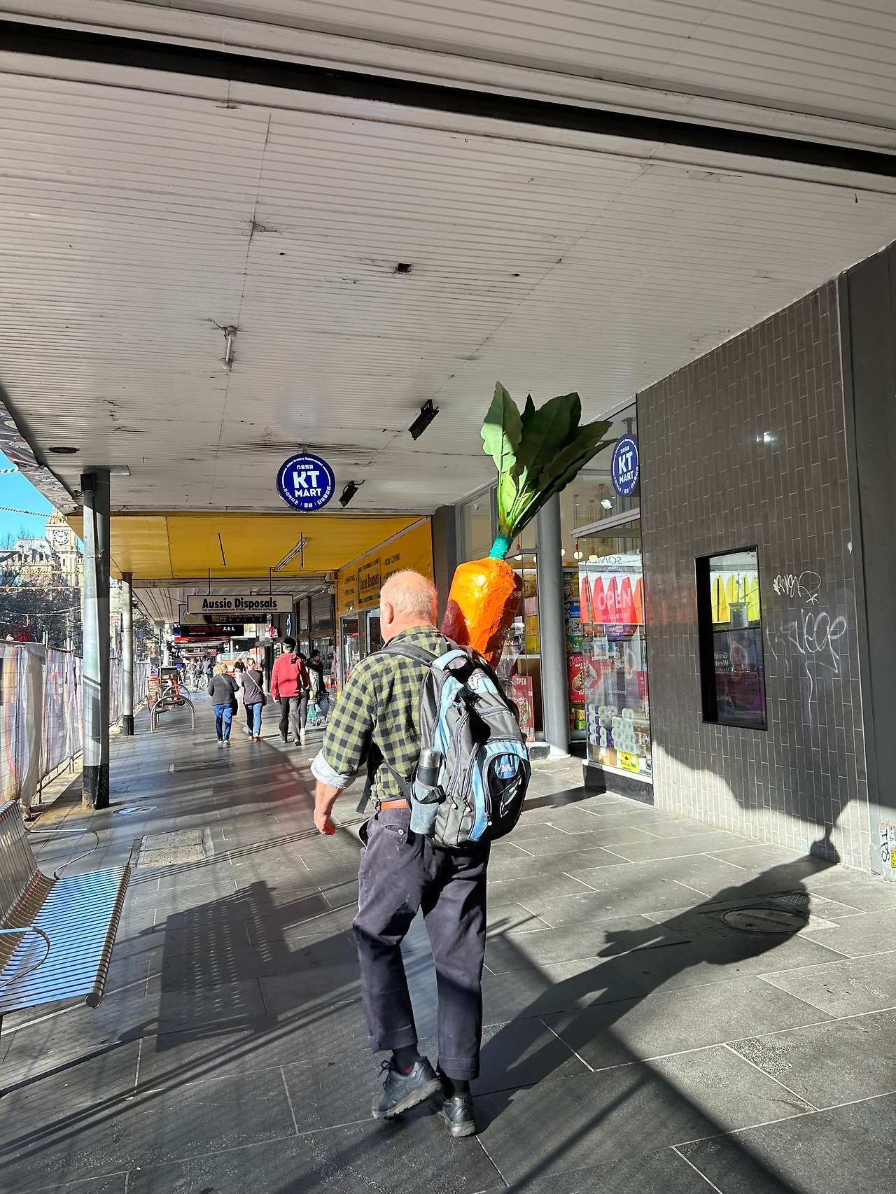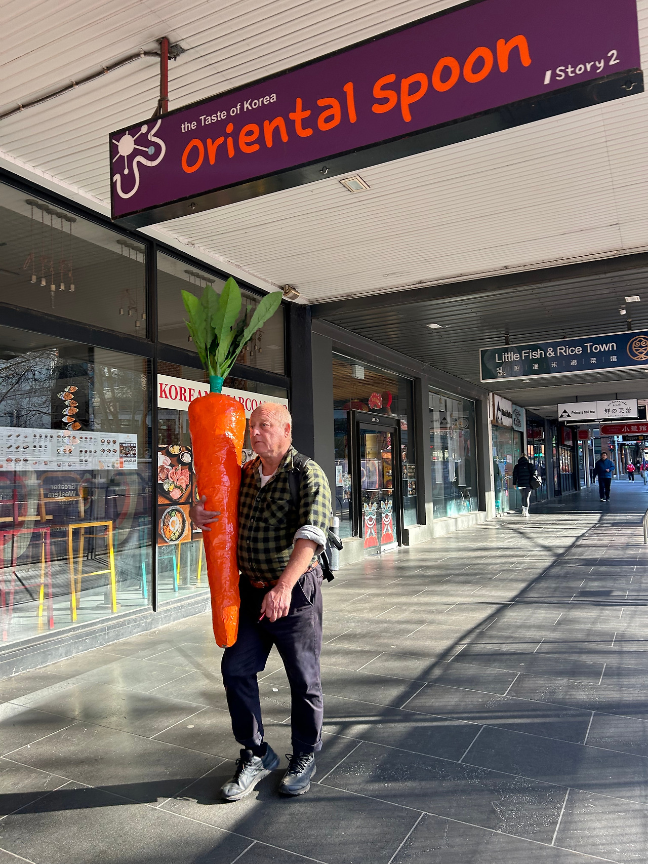 식당으로 가는 길에 멜버른의 유명인사라고 하는 캐럿맨을 만났다. 당근을 들고 멜버른 시내를 걸어 다니는 캐럿맨. 자신을 본 다른 사람들이 행복했으면 하는 마음으로 시작했다고 하는데 정작 캐럿맨의 표정은 행복해 보이지 않아서 친구가 의아해하였다. 캐럿맨도 행복하세요!