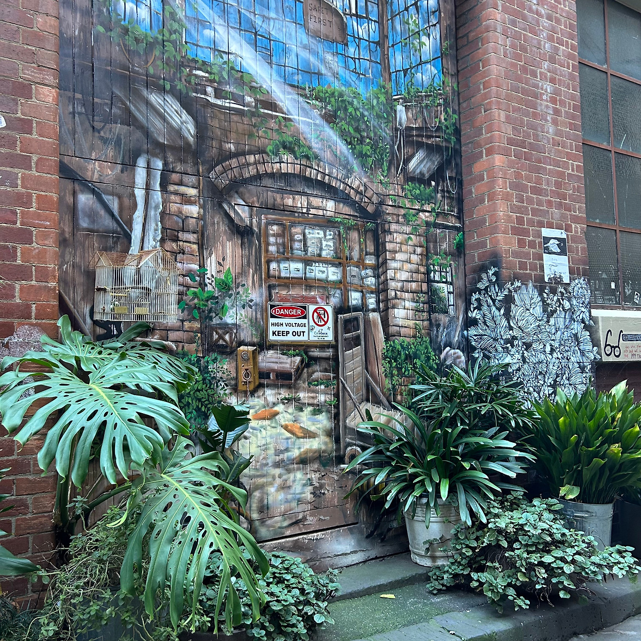 식당에 가는 길에 골목 곳곳이 멋있어서 사진을 많이 찍었었는데 알고 보니 아트 거리로 지정된 곳이었다. 멜버른에는 드라마 <미안하다 사랑하다>를 촬영한 거리로 유명한 호시어레인(Hosier Ln) 벽화 거리가 있고, 시내 이곳저곳이 벽화 거리로 지정되어 있다. 구글 맵에 street art라고 검색하면 멜버른 시내에서 갈 수 있는 벽화 거리가 많이 나온다.