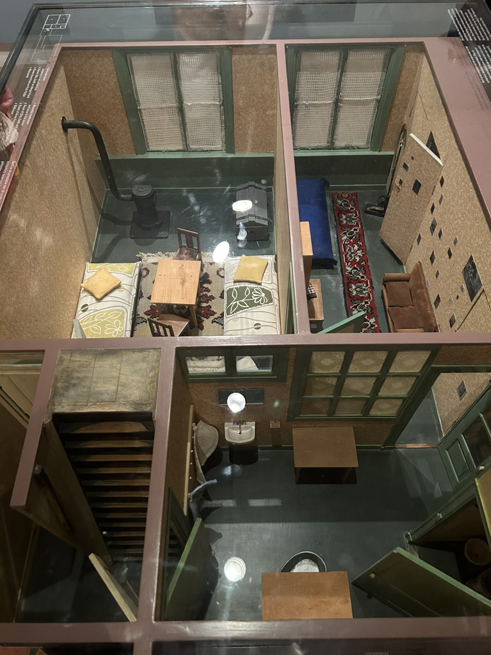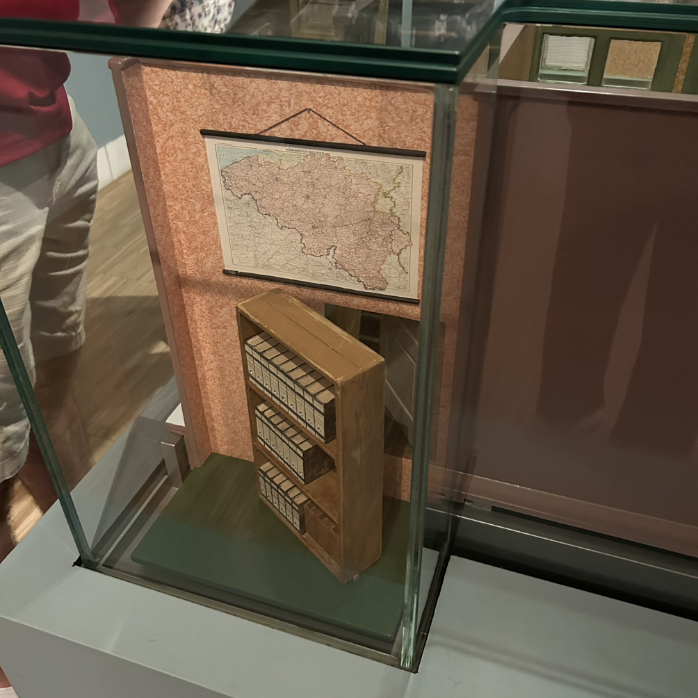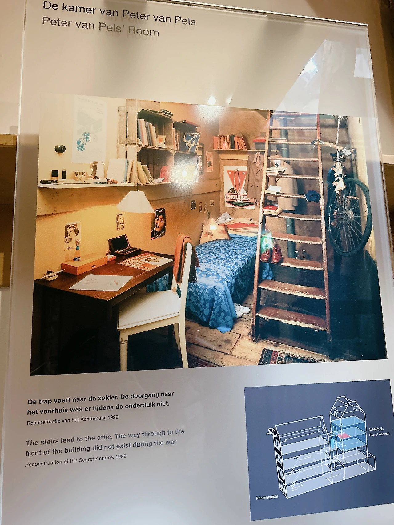 은신처의 입구에는 책장이 있다. 원래는 책장이 없었지만 은신처를 더 숨기기 위해 책장을 놓았다고 책에 쓰여있다. 실제로 당시에 썼던 책장인지는 모르겠지만 은신처 입구에 전시를 위해 고정해 놓은 책장이 있었다. 책장을 보는 순간 울컥했다. 책장 속에 숨어 사는 기분은 어땠을까?