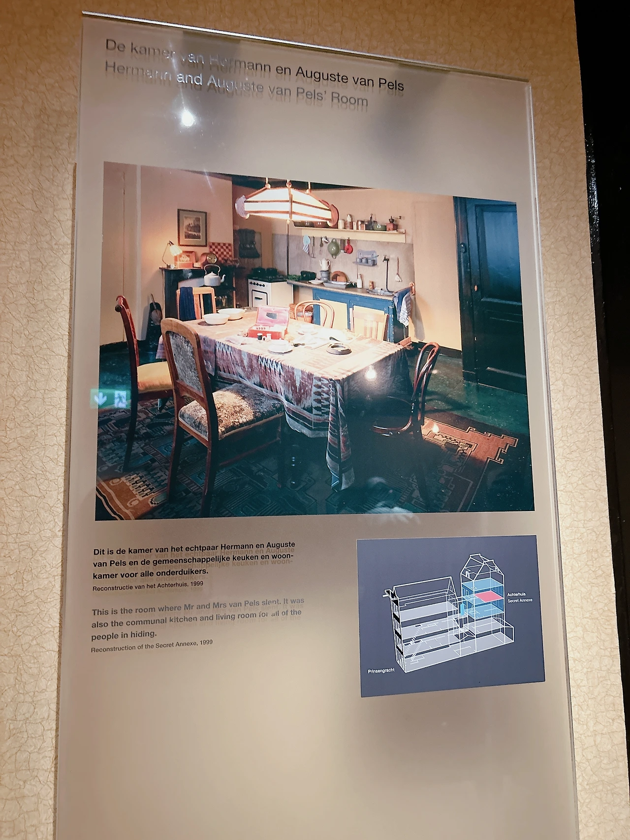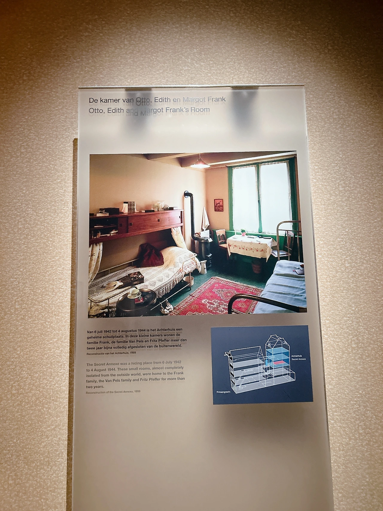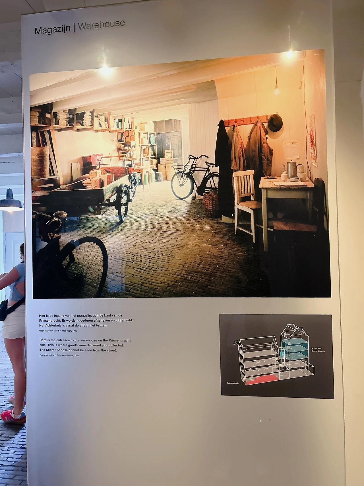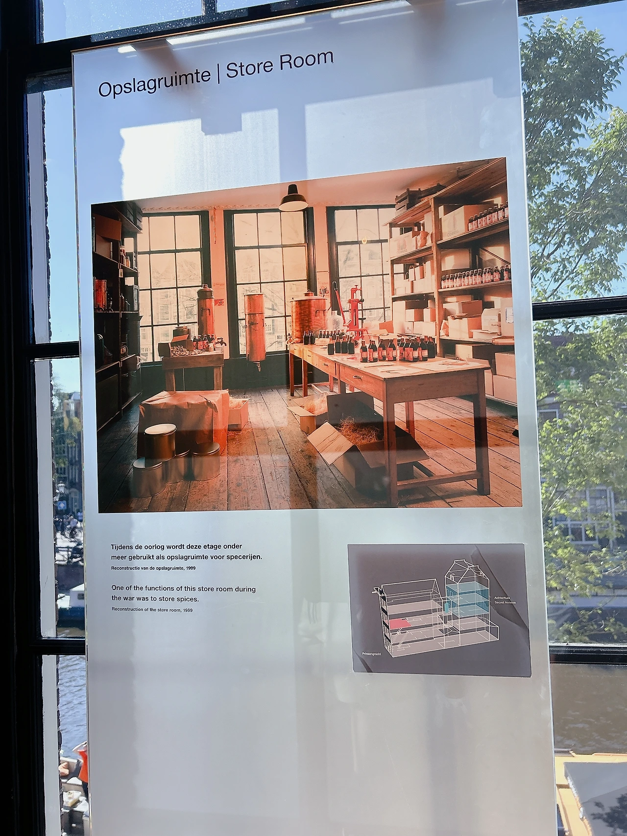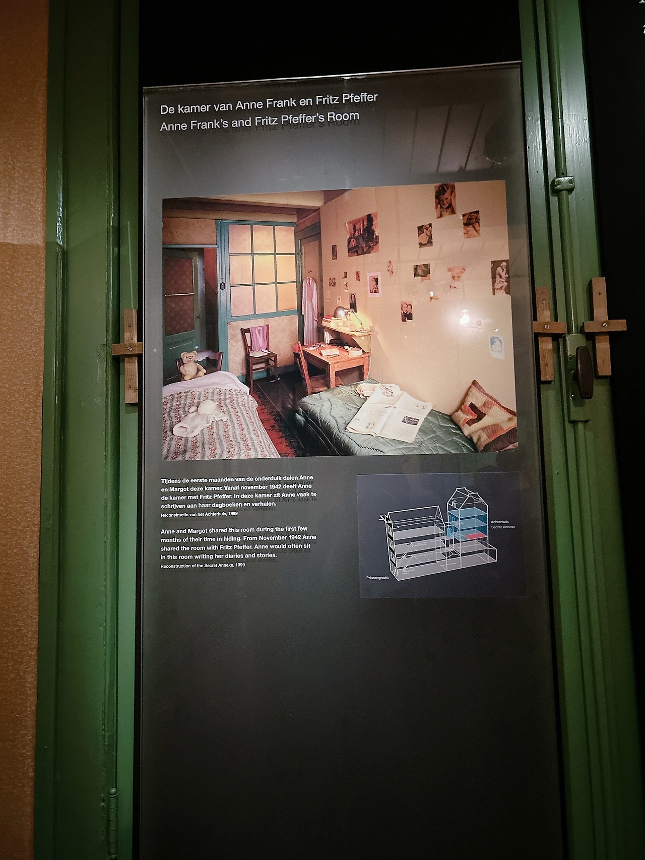 1940년대, 안네의 은신처는 안네의 아빠 오토 프랑크의 회사 사무실 뒤로 이어진 건물에 있었다. 그래서 박물관에 가면 회사 사무실로 쓰였던 방과 은신처로 쓰였던 방 모두를 볼 수 있다. 박물관에 입장하면 1층과 2층은 회사 사무실로 쓰였던 방들로 이어진다. 박물관 내부에서는 사진 촬영을 금지하고 있다. 1940년대 당시 사무실의 모습을 추정하여 만든 사진과 현재 위치를 표시한 그림만 찍었고, 그 사진을 함께 올린다.