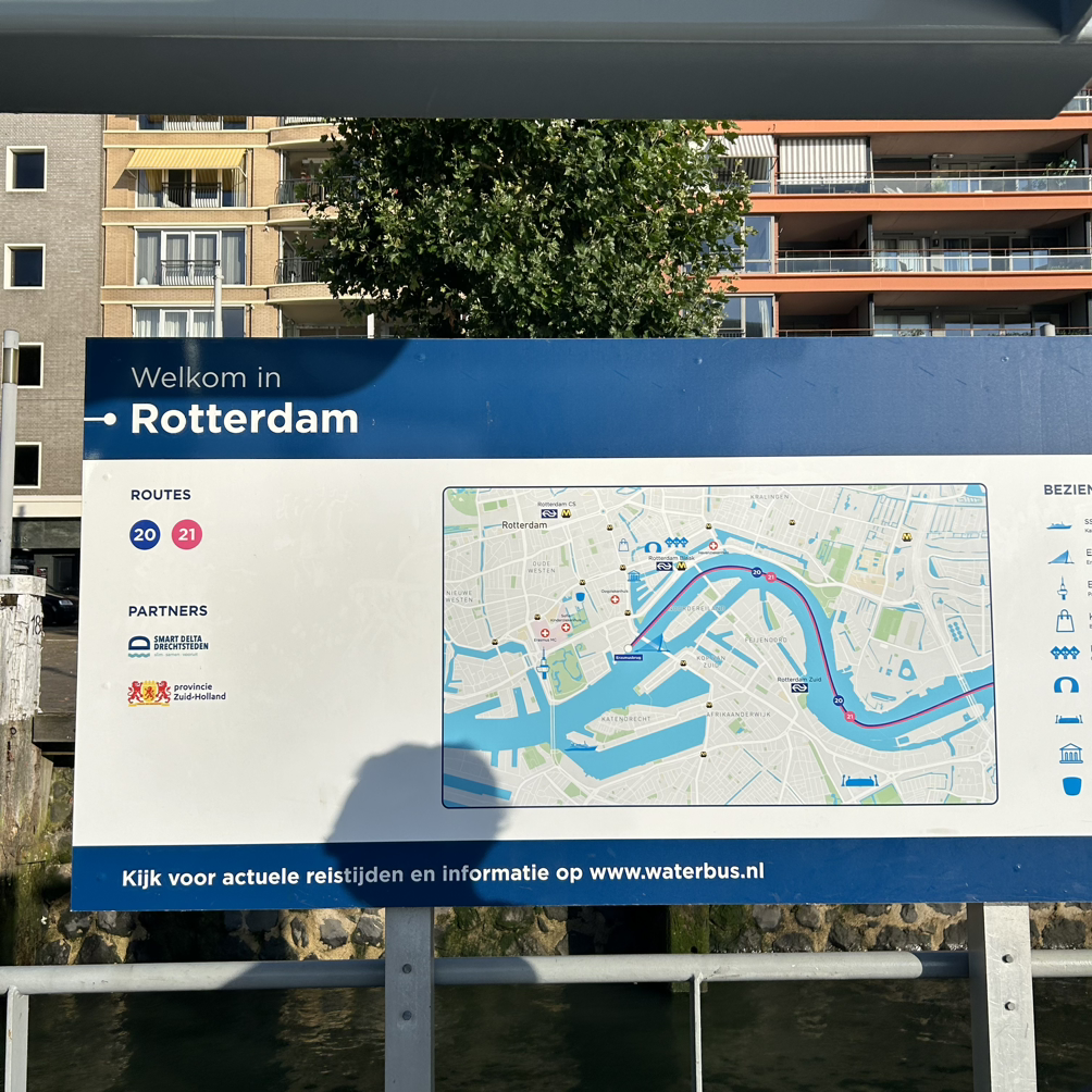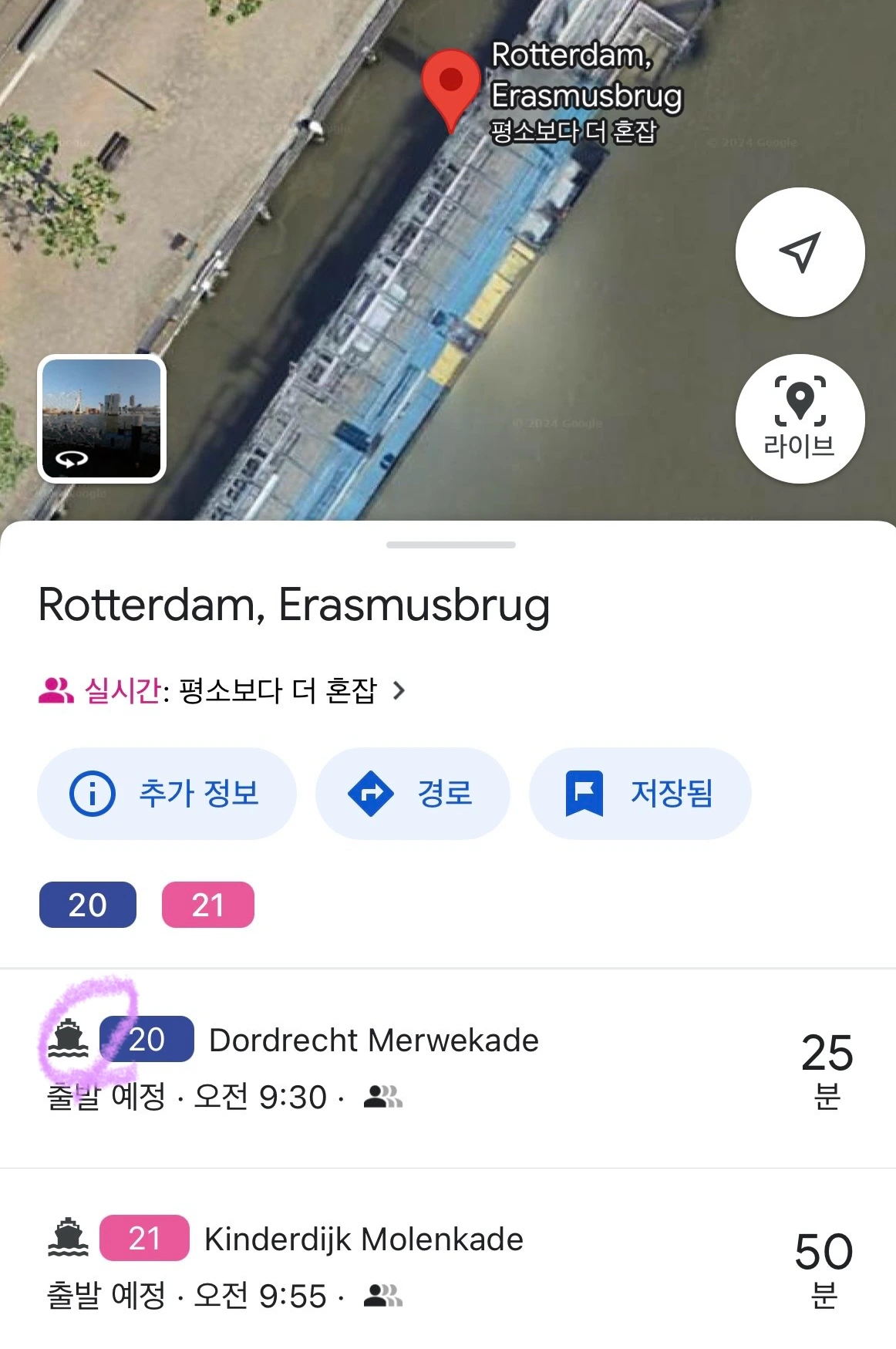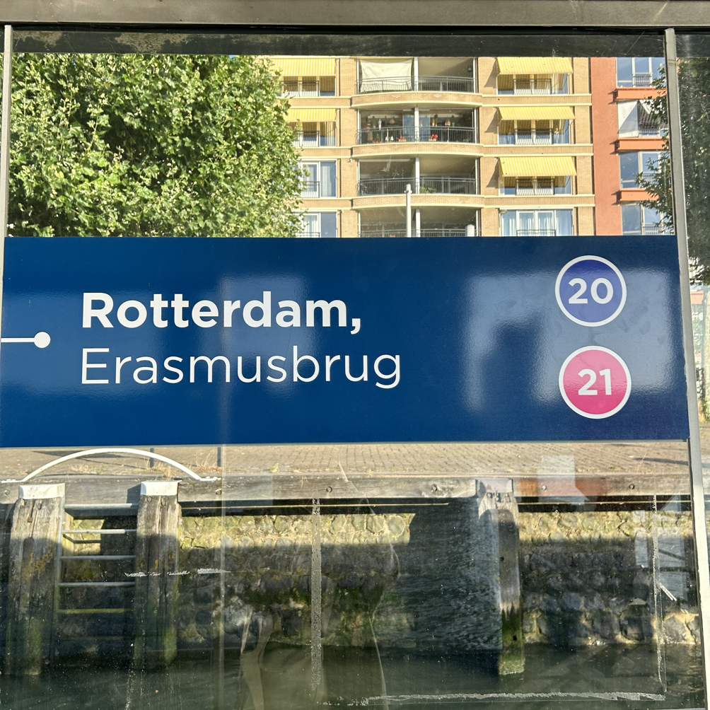 로테르담에서 수상 버스를 타려면 수상 버스 정류장(Rotterdam, Erasmusbrug) 으로 가야 한다. 아래 사진처럼 구글 맵에서 수상 버스 정류장은 배 모양의 그림으로 표시되어 있다. 니우어마스 강(Nieuwe Maas) 위에 있는 수상 버스 정류장(Rotterdam, Erasmusbrug) 에는 20번과 21번 버스가 정차한다. 두 버스의 노선은 다르다.