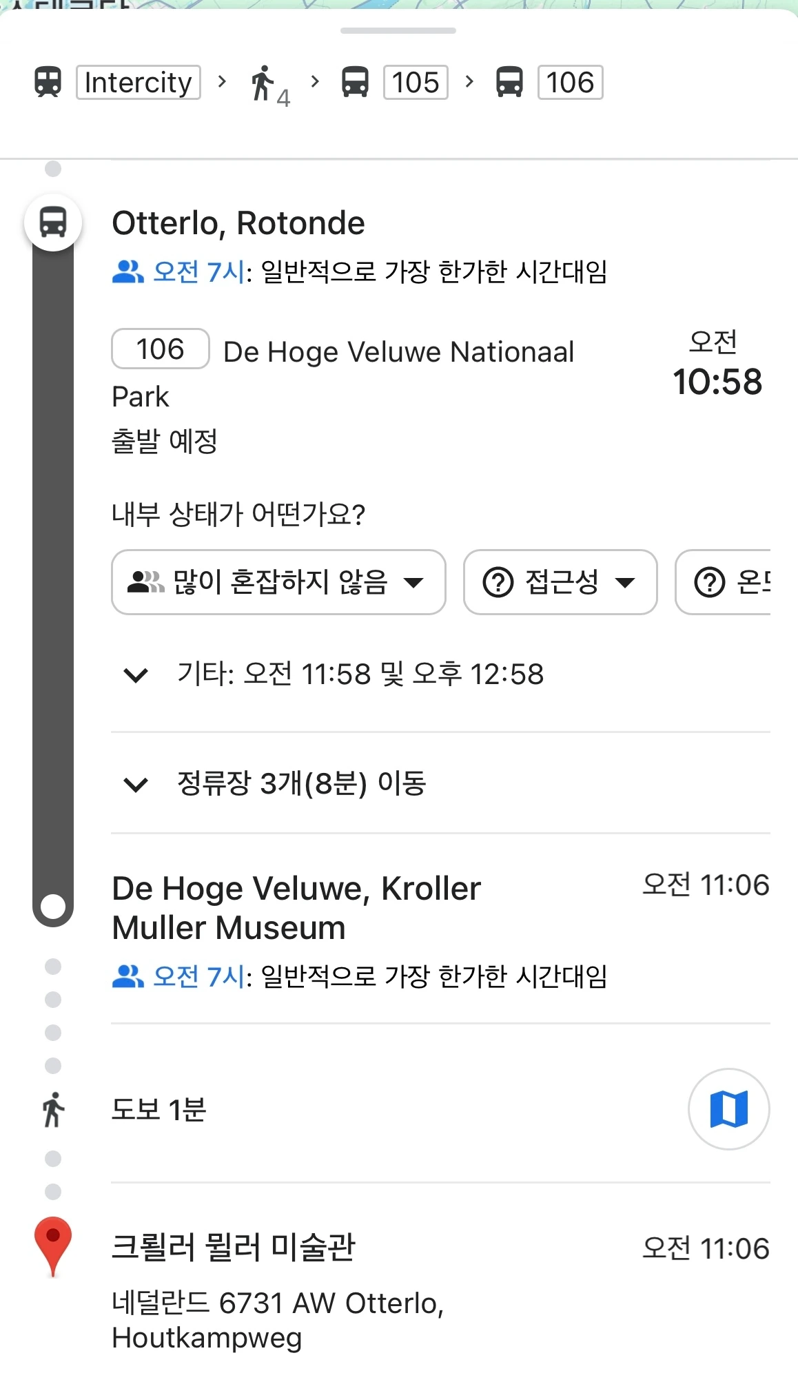 ☞ 105번 버스와 106번 버스는 오털로 버스 정류장(Otterlo, Rotonde) 에서 환승한다. 두 버스 모두 1시간에 1대씩 운행하지만, 각 버스가 도착하면 다음 버스가 출발하기 때문에 첫 번째 버스만 잘 타면 다음 버스로의 환승은 원활하다.