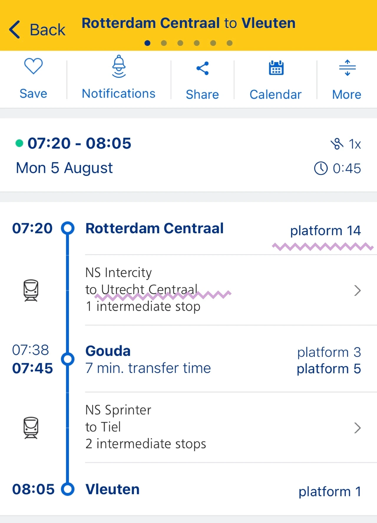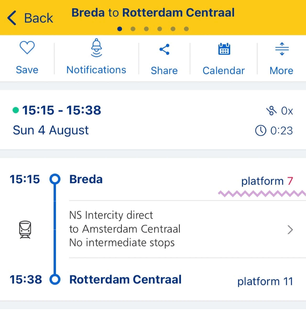네덜란드 기차는 NS 앱으로 노선을 조회하고 결제할 수 있다. 따로 예매하지 않고 전철을 타는 것처럼 출입구에 있는 개찰기에 카드를 찍고 타도 된다. 컨택트리스 카드로도 탑승이 가능하다. 출발 역과 도착 역을 쓰고 조회 버튼을 누르면 가장 빠른 시간부터 기차 시간을 확인할 수 있다. 아래 사진처럼 로테르담 중앙역에서 출발할 때에는 플랫폼 14번으로 가서 Utrecht Centraal행 열차를 타면 된다.