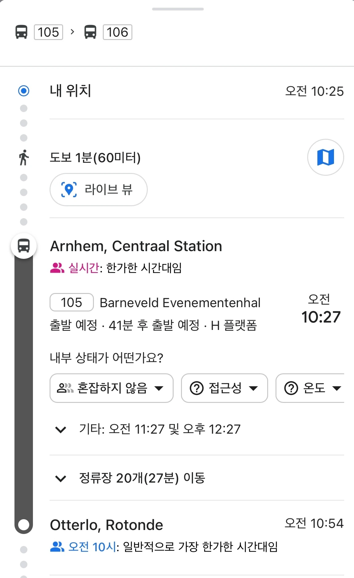 * 아르넴 역 버스 정류장(Arnhem, Centraal Station) - 오털로 버스 정류장(Otterlo, Rotonde) : 105번