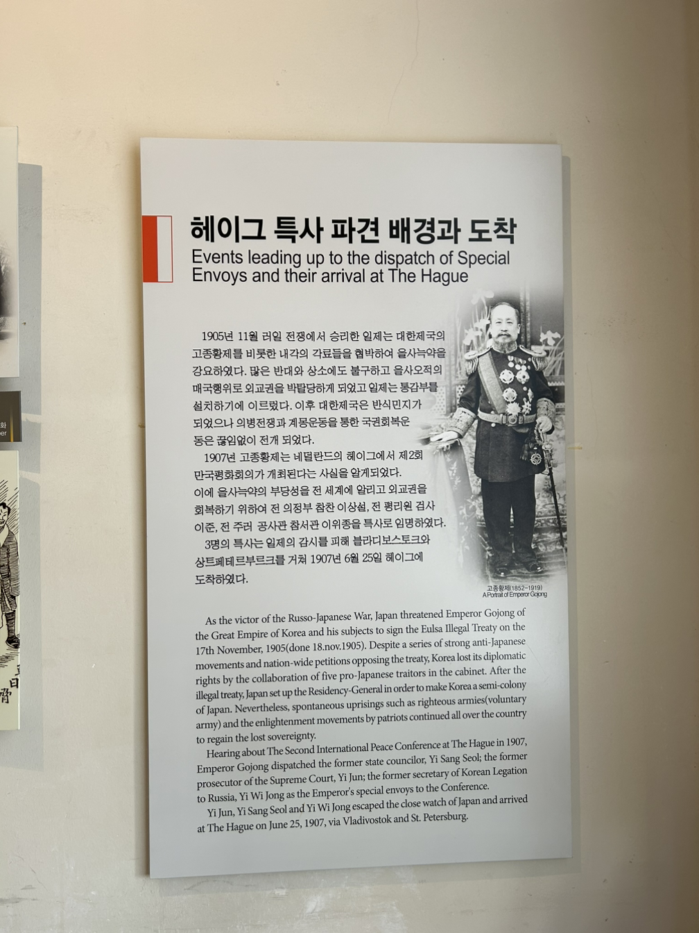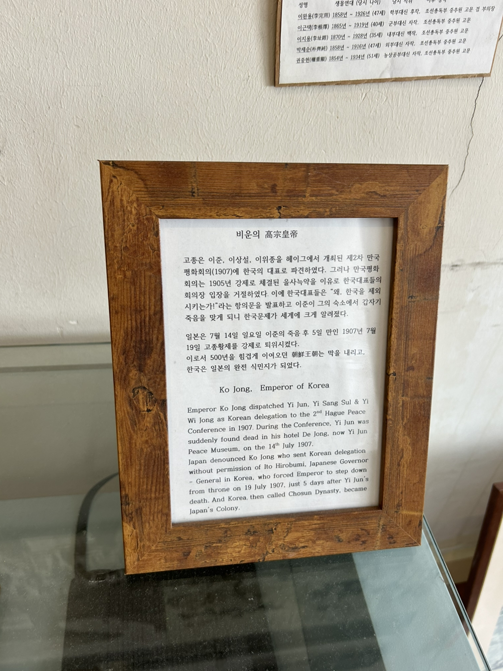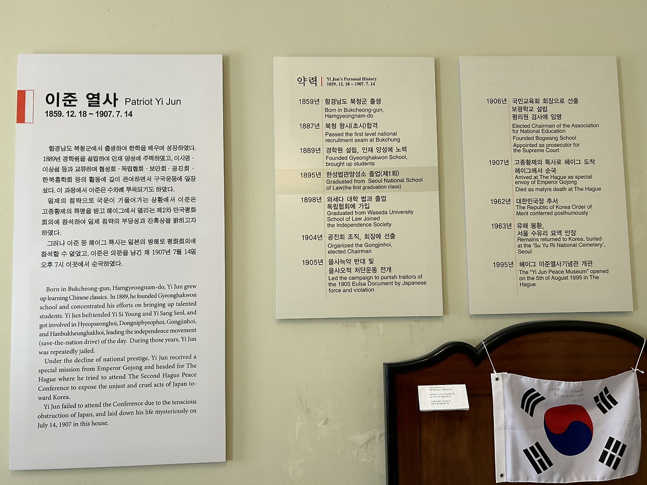이준 열사 기념관은 네덜란드에 살고 있는 한인 노부부 두 분이서 운영하고 있다. 2층에 위치한 박물관 입구에서 입장권을 살 수 있고, 노부부께서 전시 순서를 안내해 주신다. 2층과 3층의 각 방마다 헤이그 특사와 관련된 역사 내용과 자료들이 전시되어 있다. 처음에 전시되어 있는 이준 열사의 유훈을 읽어보았다.