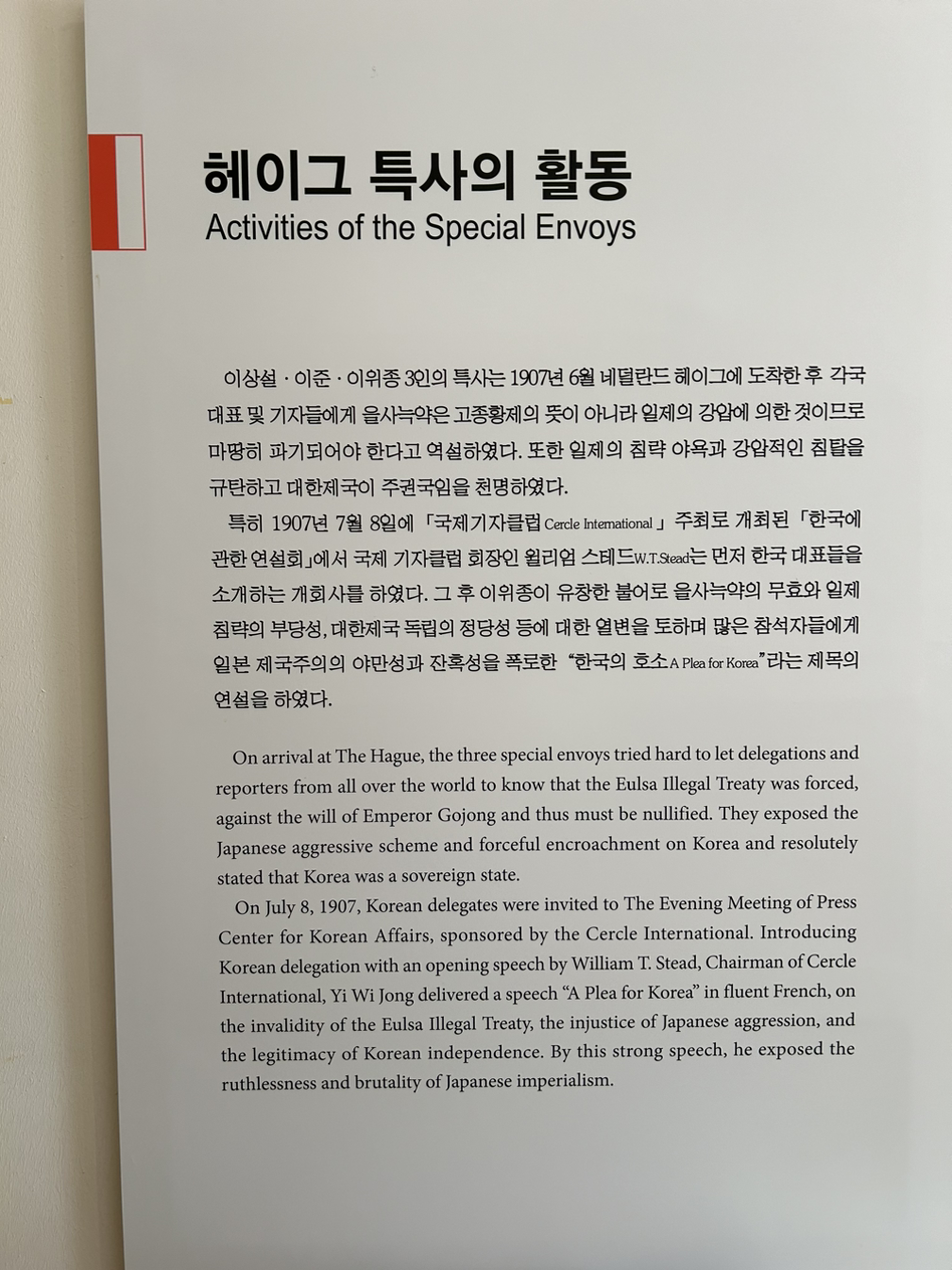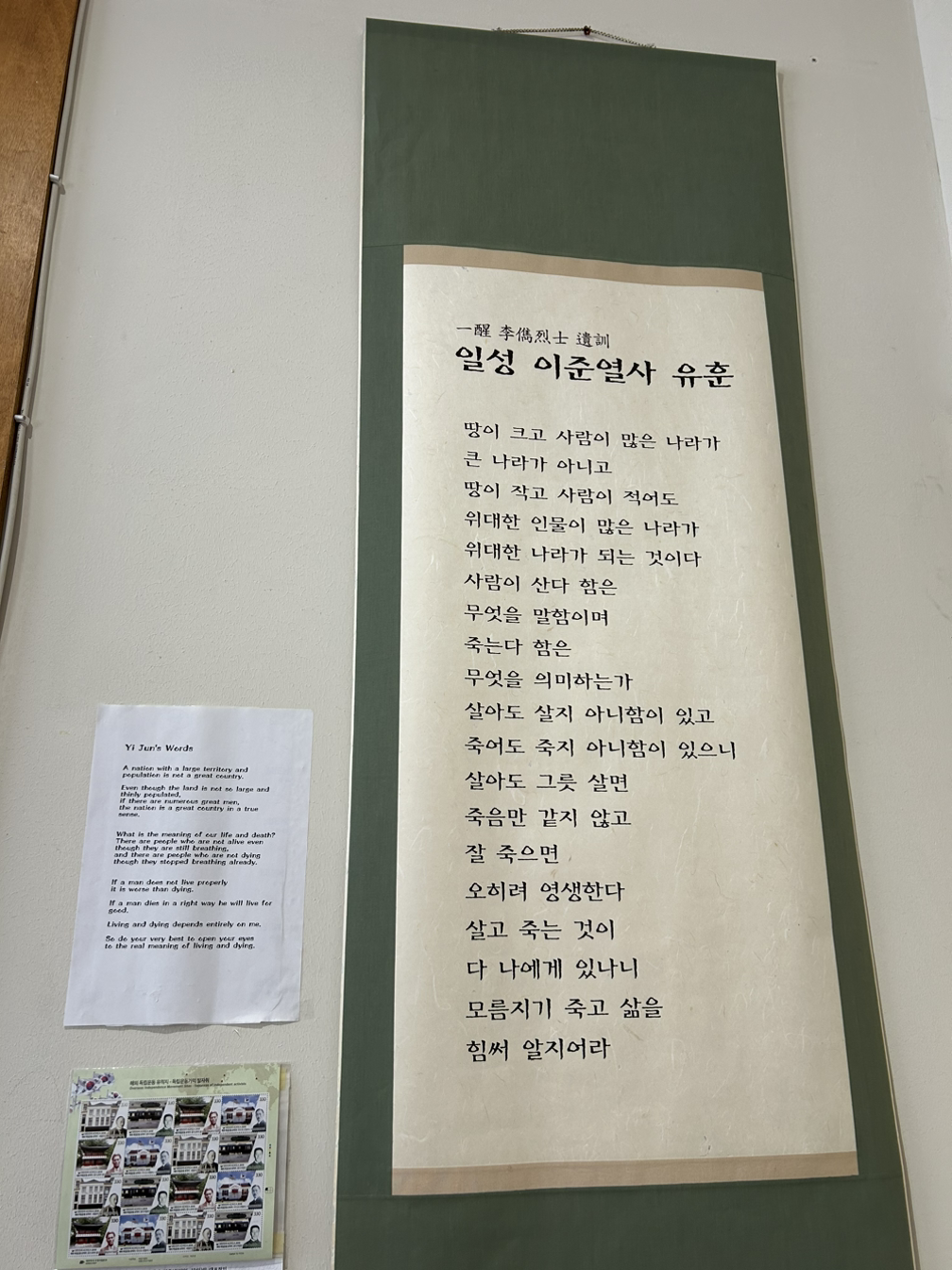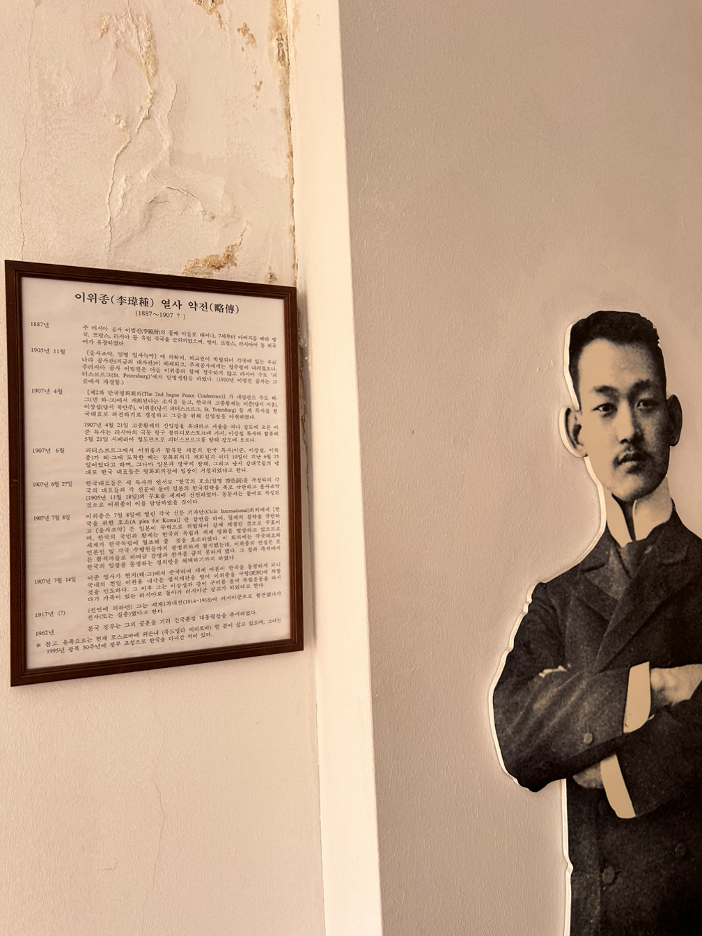 이준 열사 기념관은 네덜란드에 살고 있는 한인 노부부 두 분이서 운영하고 있다. 2층에 위치한 박물관 입구에서 입장권을 살 수 있고, 노부부께서 전시 순서를 안내해 주신다. 2층과 3층의 각 방마다 헤이그 특사와 관련된 역사 내용과 자료들이 전시되어 있다. 처음에 전시되어 있는 이준 열사의 유훈을 읽어보았다.