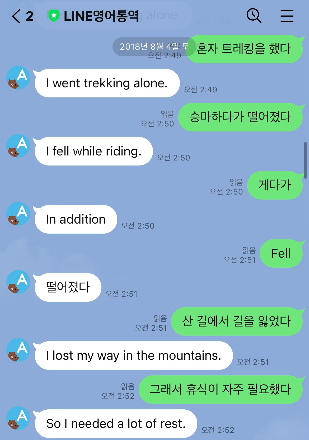 -감사함을 전하고 싶어 편지를 씁니다. 나는 처음으로 혼자 해외여행을 하고 있습니다. 해외를 가 본 적은 있지만 누군가와 함께였어요. 나는 유럽을 처음 방문 했습니다. 혼자 트레킹을 했고, 승마를 하다가 떨어졌었어요. 게다가 산 길에서 길을 잃기도 했습니다. 그래서 휴식이 자주 필요했습니다. 나를 챙겨주고 따뜻하게