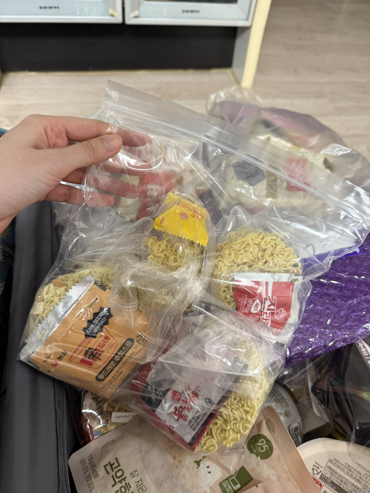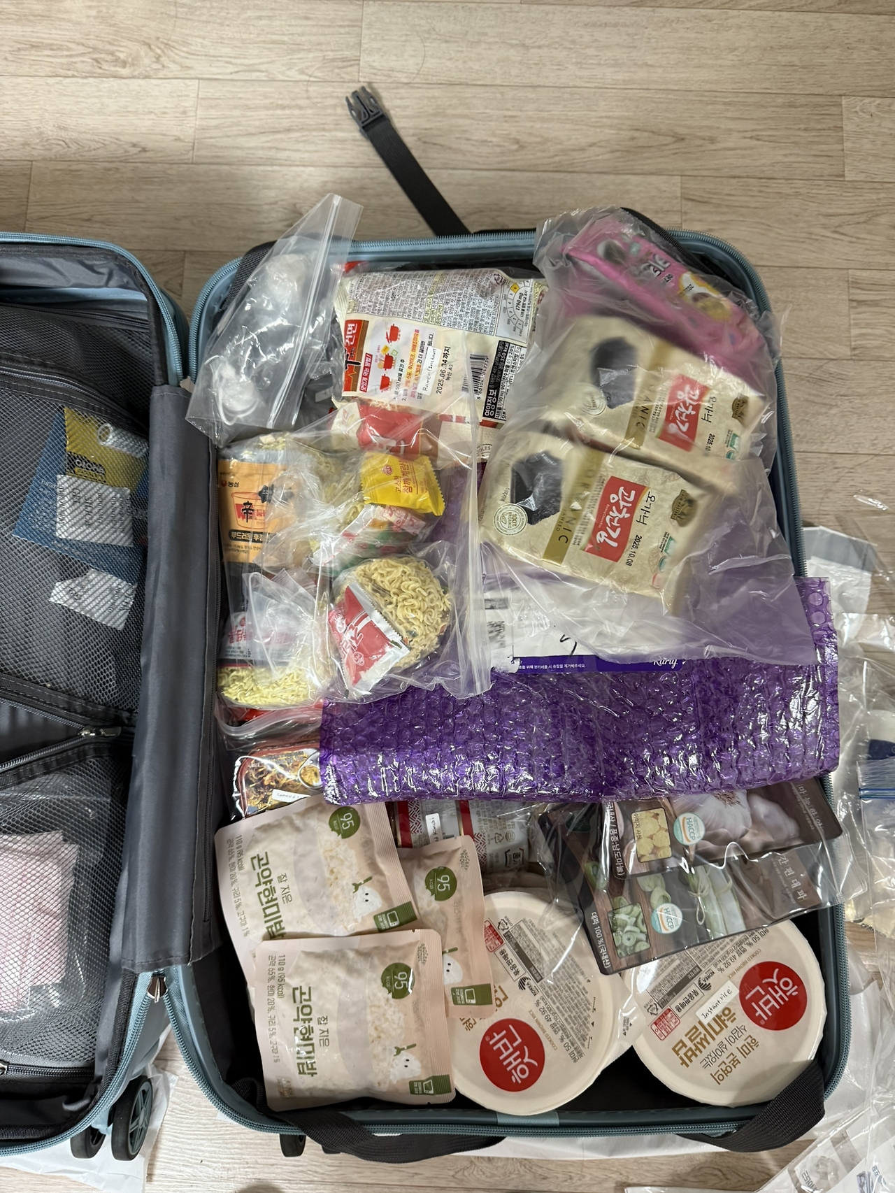 문제는 입도 4개라 얼마나 많은 양을 챙겨야 할지 가늠이 잘 안 갔다. 그래서 나는 기내용 캐리어와 위탁수화물용 캐리어 2개를 챙기고, 위탁수화물용 캐리어 한 칸을 식품 칸으로 만들었다. 혹시나 공항에서 입국 수속을 할 때 캐리어를 열어야 한다면 내 캐리어만 열도록 하는 게 효율적일 거 같았다. 그리고 그건 실제로 일어났다. 뉴질랜드 여행을 여럿이 여행한다면 한 사람의 캐리어에 라면, 햇반 등 식품을 다 모아서 넣는 게 좋다. 햇반 11개를 챙기며 이게 맞나? 싶었는데 이게 맞았다. 아이들이 매우 잘 먹어주어 여행 중반에 식품 칸은 모두 비워졌다.