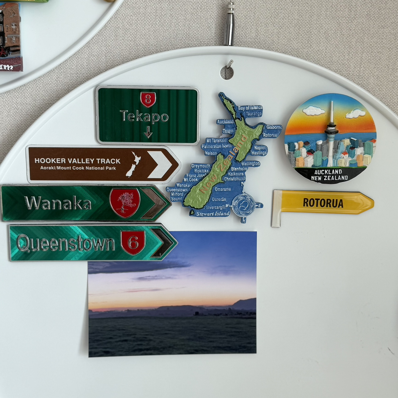 와, 로드트립이라니! 뉴질랜드는 로드트립을 하는 경우가 많아서 그런지 기념 자석도 각 지역 도시 이름과 도로 표지판 모양으로 되어있었다. 보통 여행을 하면 방문한 도시 중 하나의 도시만 골라 나를 위한 기념 자석 1개만 사는 편이다. 하지만 이번에는 첫 해외 로드트립을 기념하고 싶어서 방문한 도시마다 기념 자석들을 샀다.