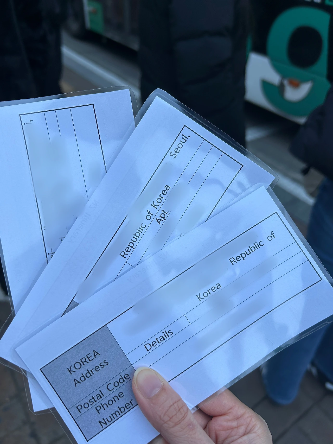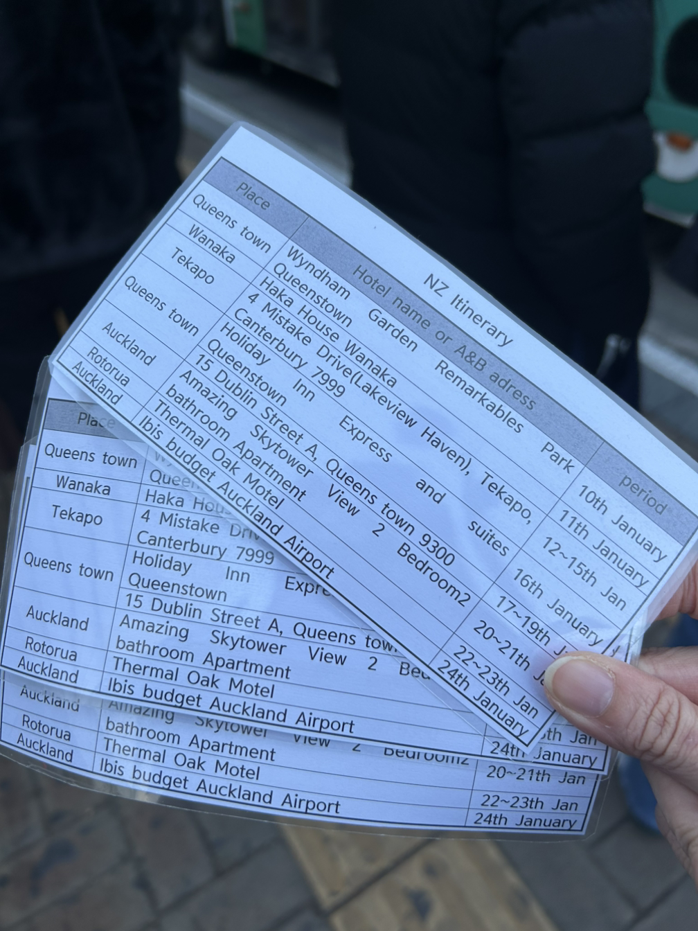 다섯 번째로 준비할 건 비상 연락망이었다. 귀국할 때 비행기는 경유 2회였고, 경유 시간이 2시간 정도로 짧은 편일 때가 있어 짐 분실이 우려되었다. 그래서 친구들의 집 주소를 받아 영문 이름표를 만들었다. 이름표의 앞에는 뉴질랜드 일정, 뒤에는 한국 주소를 적었다. 짐을 잃어버려도 시점에 따라 보내주기 편하게 만들었다. 어떻게든 돌려받겠다는 의지랄까. 이 정도 했는데 잃어버리면 그건 어쩔 수 없는 거겠지.
