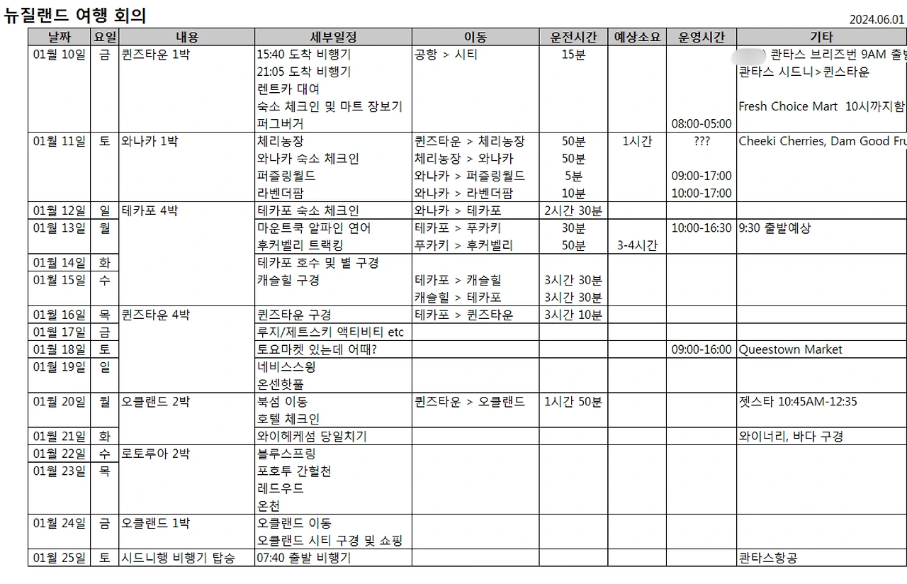 우리의 여행은 뉴질랜드 남섬과 북섬 모두 여행하는 일정이었다. 대략적인 여행 일정은 다음과 같았다.