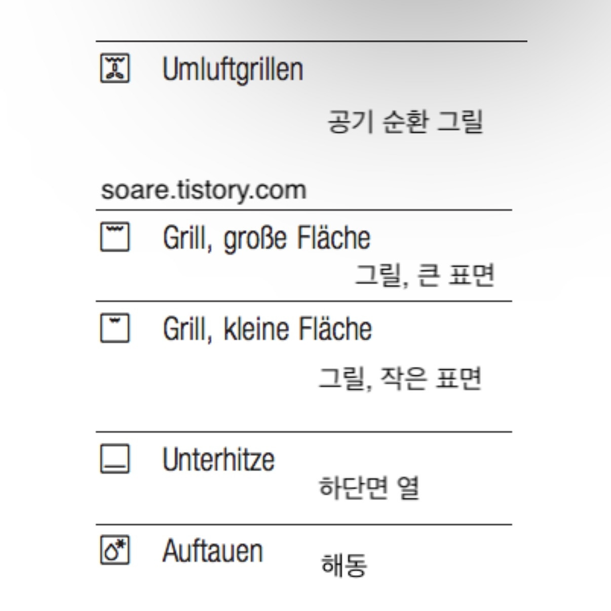 숙소에 있는 오븐은 보쉬(Bosch) 라는 독일에서 나온 오븐이었다. 보쉬 오븐은 용도별로 다양한 상징 그림이 있었다. 따로 설명서가 없어서 인터넷으로 검색하였고, 오스트리아에 거주하시는 분께서 친절하게 그림을 설명한 자료를 찾게 되었다.