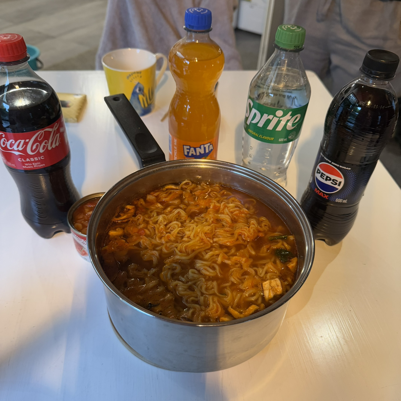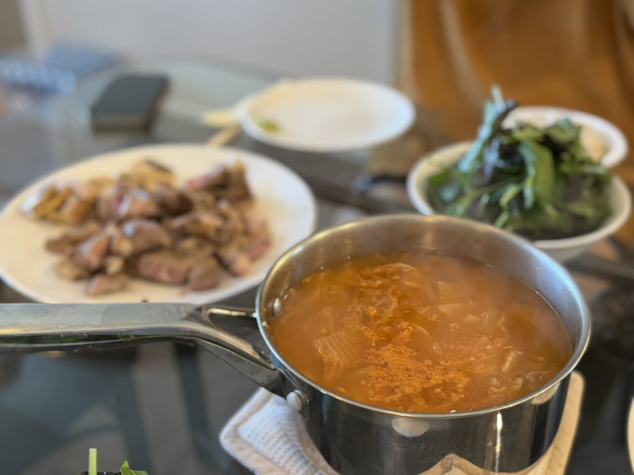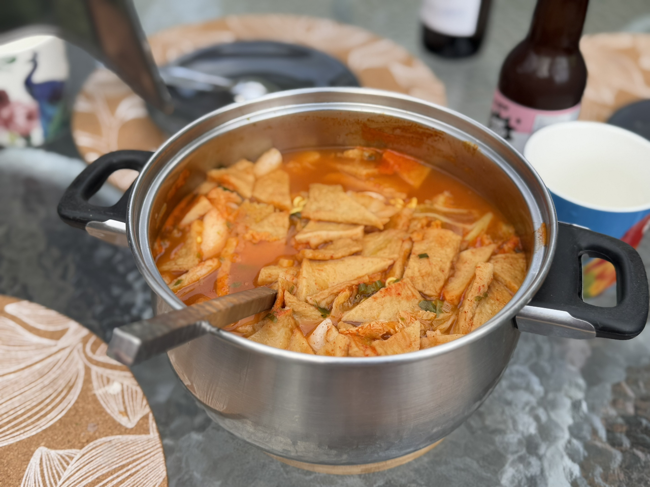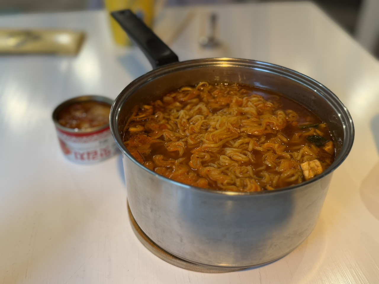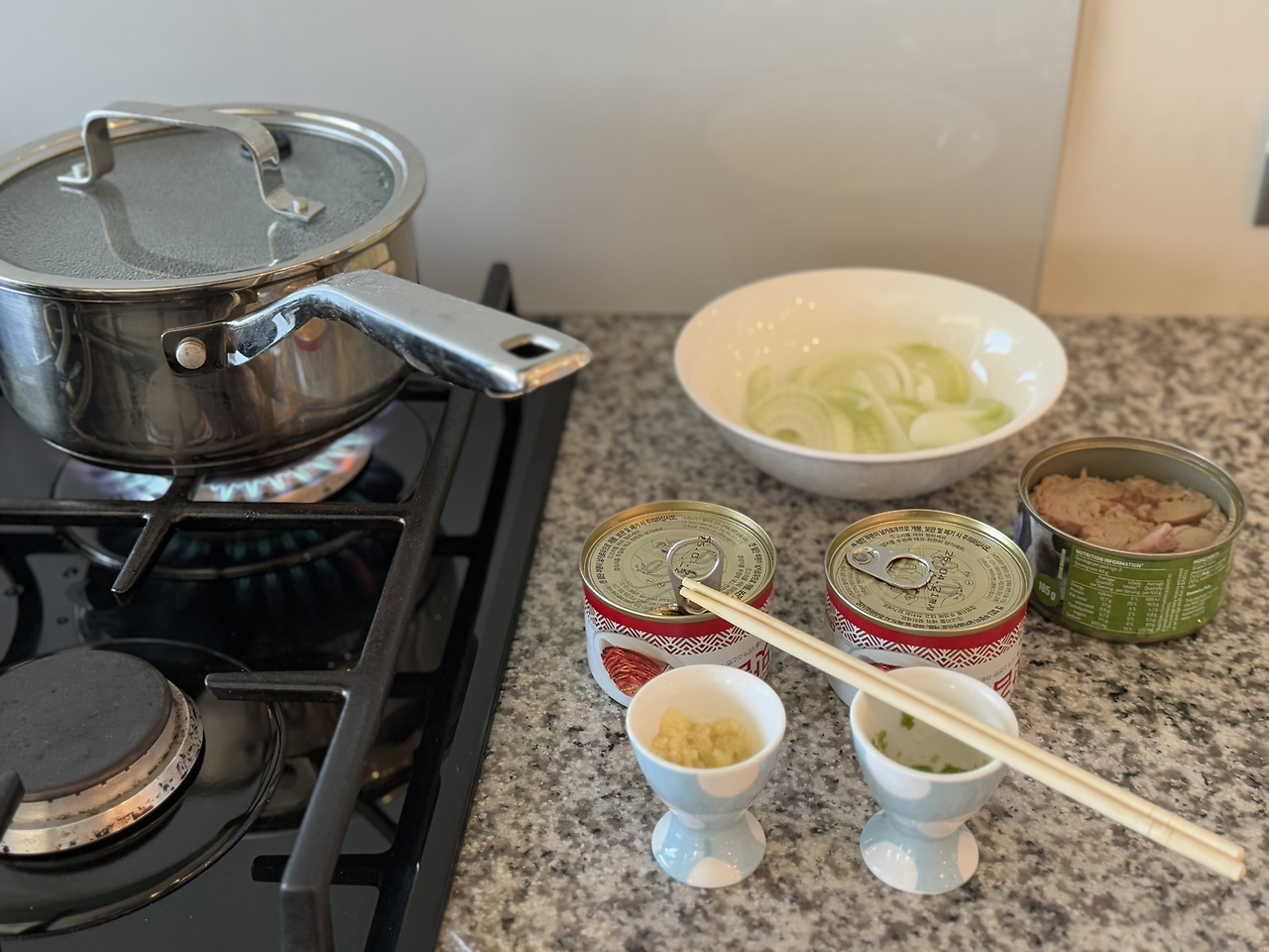김치찌개의 대부분의 재료는 내가 한국에서 챙겨 온 재료들을 넣었다. 현지 마트에서 참치 통조림과 양파만 샀다. 봉지 김치는 캐리어에서 터질 수 있어서 통조림 김치를 가지고 왔다. 동결 건조 마늘과 청양 고추는 약간의 물을 넣고 풀어주면 먹음직스러운 재료로 바뀐다. 코인 육수를 넣어 육수를 만들고, 참치, 김치, 양파, 다진 마늘, 다진 청양고추를 넣어 바글바글 끓였다. 마지막으로 챙겨 온 국간장으로 간을 하고, 고춧가루를 넣어 맵기를 조절해 주면 완성이다.