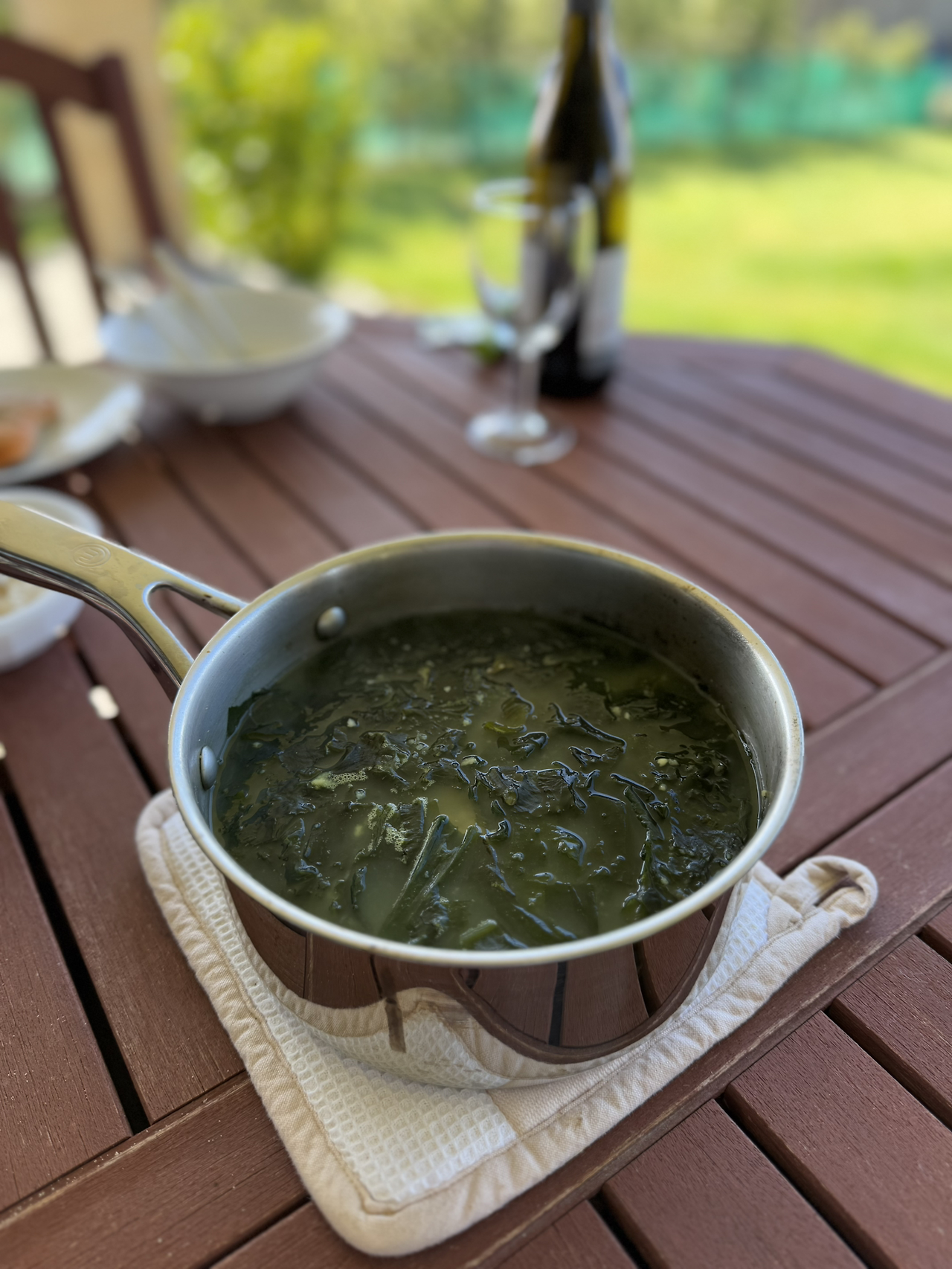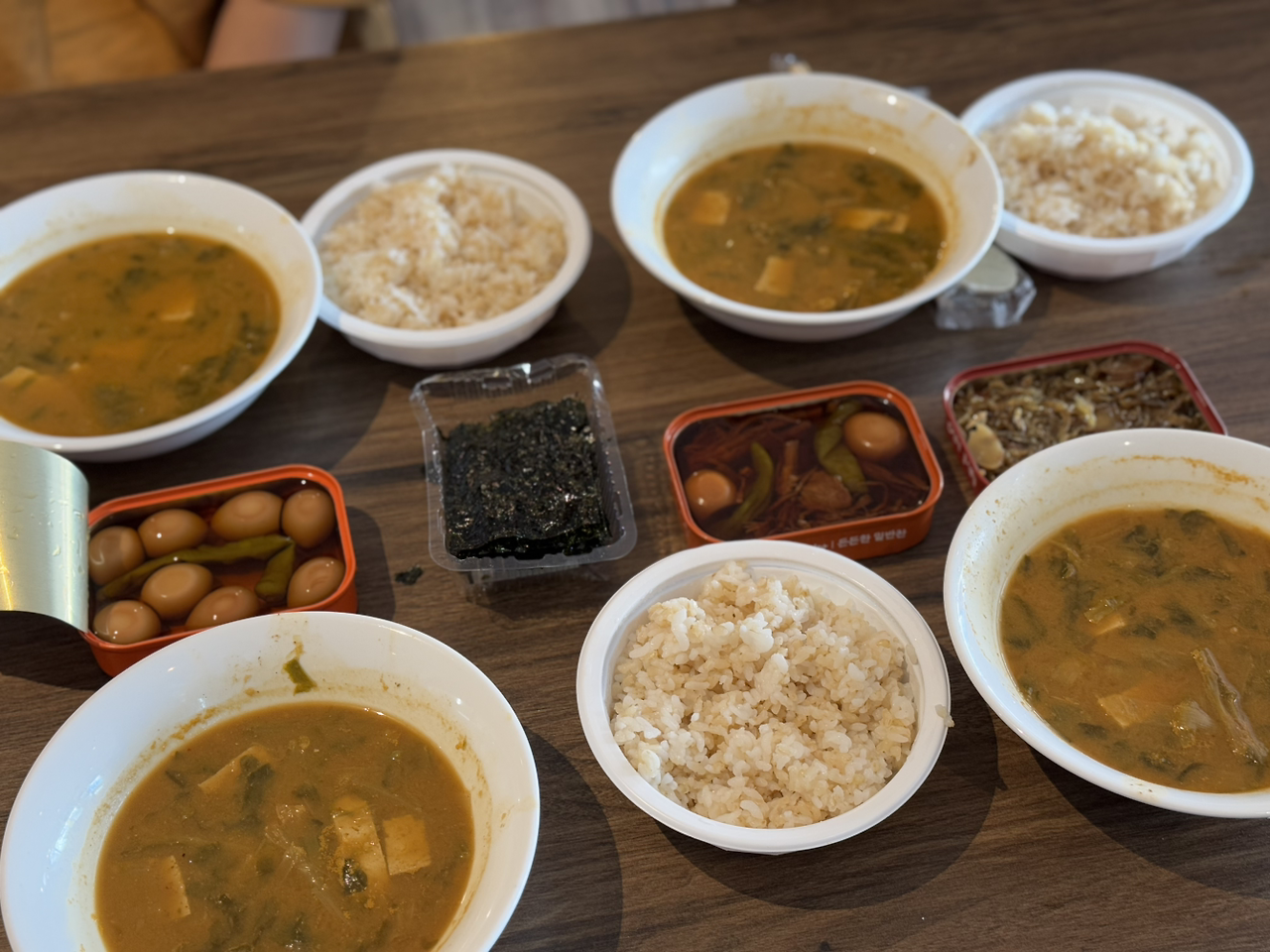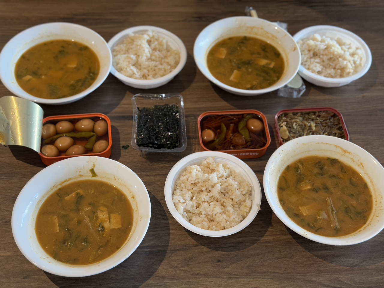 미역국은 한국에서 챙겨 온 자른 미역을 물에 10분간 불렸다. 코인 육수로 육수를 만들고, 미역과 새우를 넣고 끓였다. 동결 건조 마늘에 물을 부어 다진 마늘 상태로 만들어 넣고, 국간장으로 간을 맞추면 미역국 완성이다.