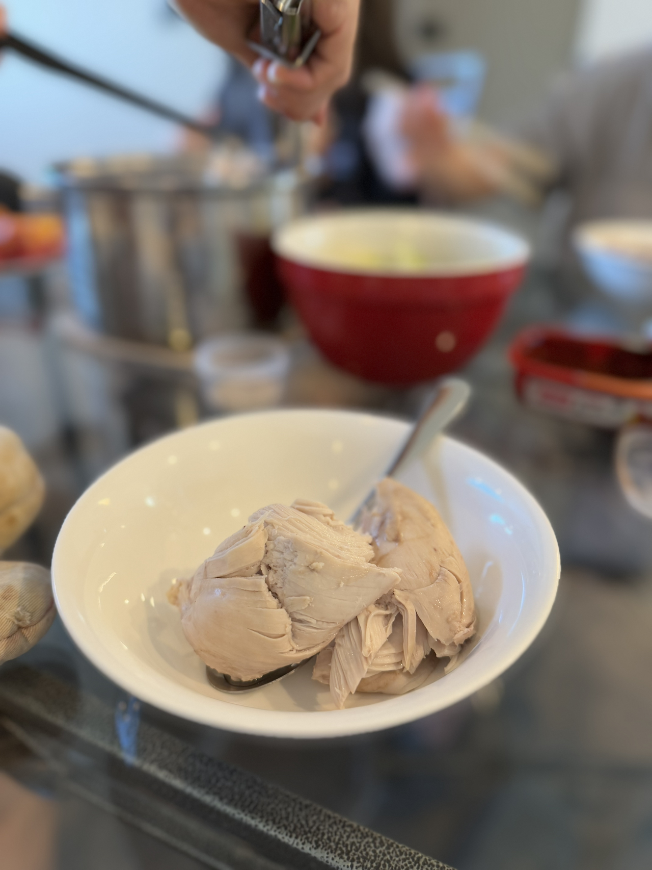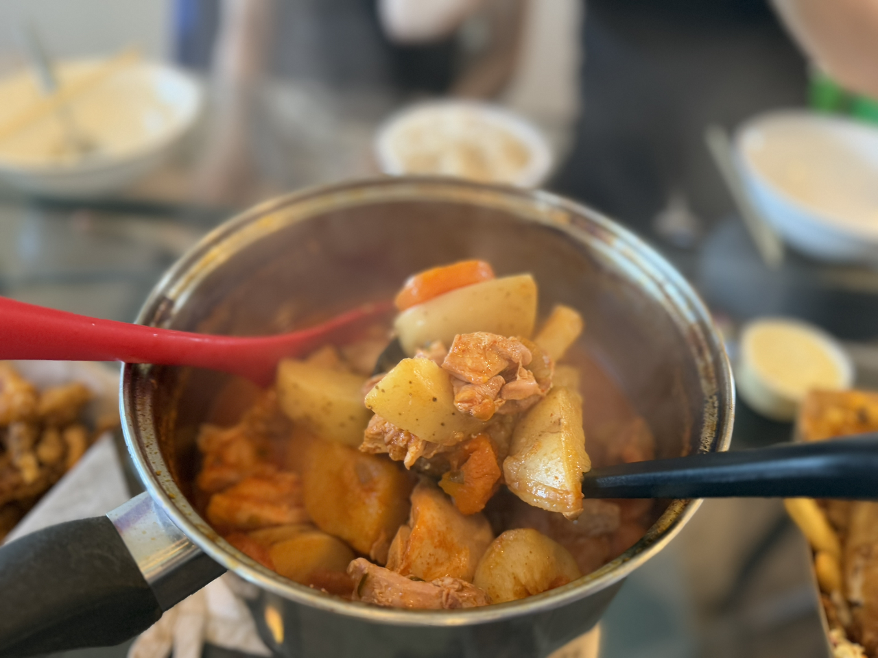 먼저 닭을 먹기 좋은 크기로 자르고, 당근과 감자를 썰었다. 재료 손질을 하는 동안 코인 육수로 육수를 만들었다. 그리고 동결건조 마늘, 청양고추, 대파 모두 물을 넣고 다진 재료 상태로 바꾸었다. 드디어 챙겨 온 고추장을 쓸 차례가 왔다. 다진 재료들을 고추장과 국간장, 고춧가루, 알룰로스와 섞어서 양념장을 만들었다. 딱딱한 채소인 당근과 감자를 육수에 먼저 끓이다가, 닭과 양념장을 넣어서 푹 끓이면 완성된다.