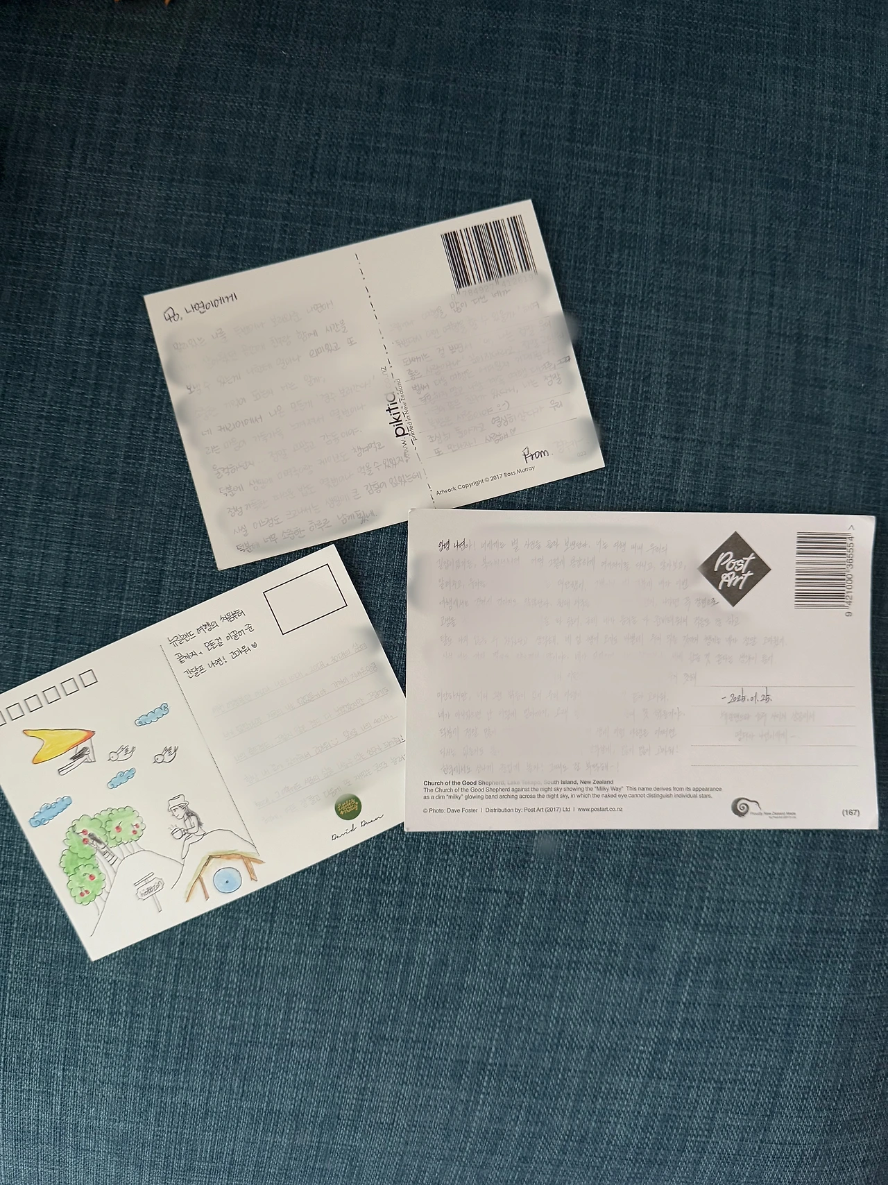 뉴질랜드 여행을 마치며 친구들은 각자 엽서에 편지를 써서 서로에게 주었다. 세 사람 모두 각자의 시간을 보낼 때 편지를 썼다고 한다. 잠귀 어두운 나는 잠을 자느라 전혀 몰랐었다. 비행기에서 편지를 읽으면 울 거 같아서 일부러 편지를 안 읽고 있다가 집에 와서야 꺼내 읽었다. 빼곡하게 적혀있는 글씨만 봐도 눈물 버튼이었다. 왜 이렇게 빼곡하게 쓰냐고! 내용을 읽고는 주체할 수 없이 눈물이 흘렀다. 소중한 사람과 시간들에 대한 가치를 알기에 고마움이 느껴져서 더 크게 울었던 것 같다. 친구들에게 편지를 받기만 하고 주지 못했기에 이번 글을 통해 답장을 보내고 싶었다.