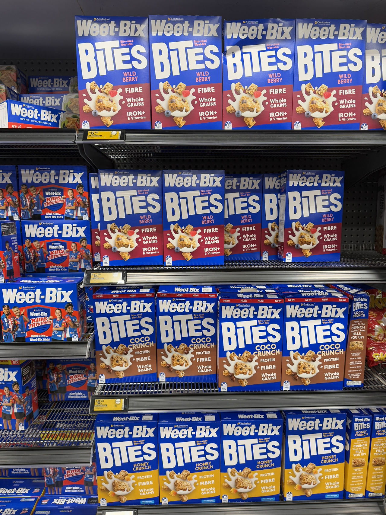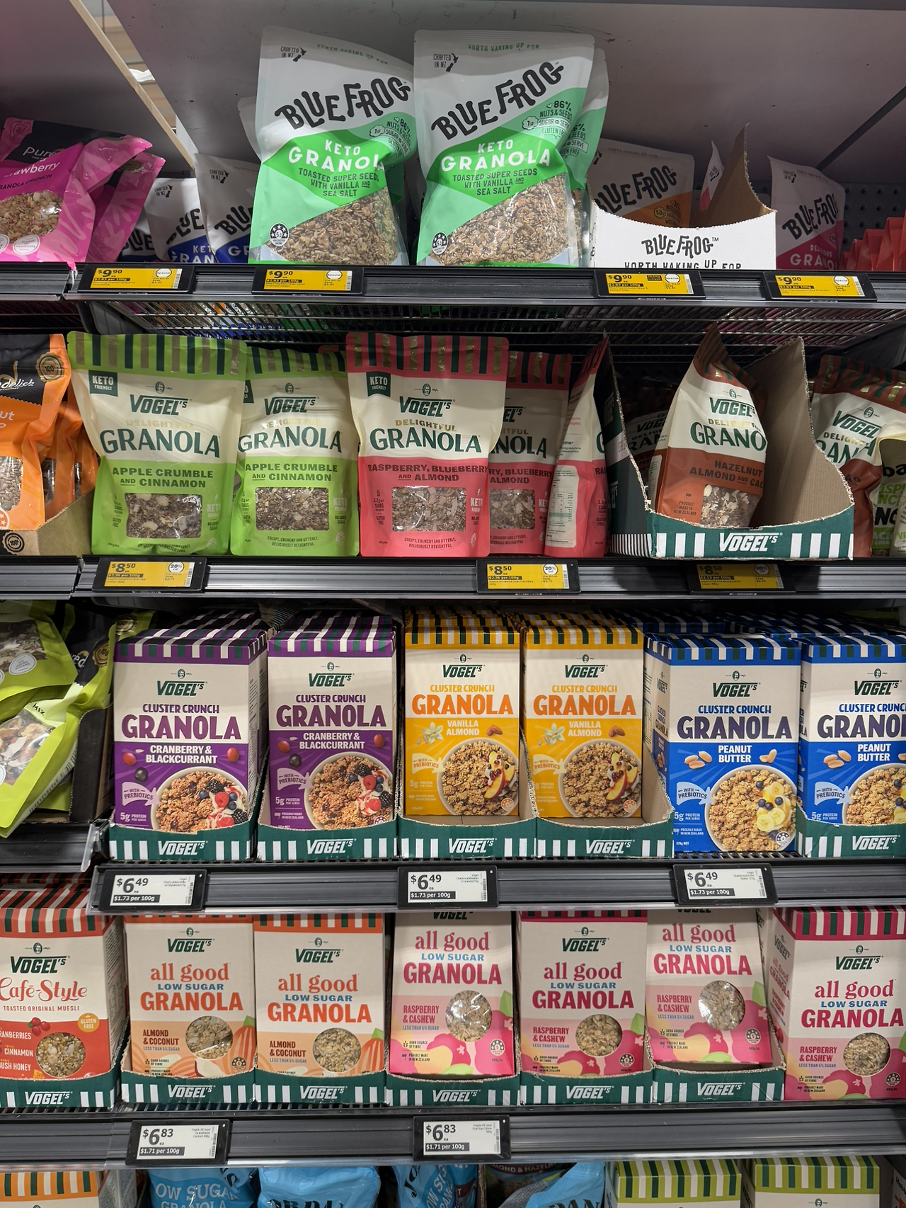 좌) 자색고구마칩. 여기도 자색고구마가 있구나. 우) 옥수수칩. 좌) 뉴질랜드에서 아침에 많이 먹는다는 위트빅스(Weet-Bix). 우) 그래놀라.