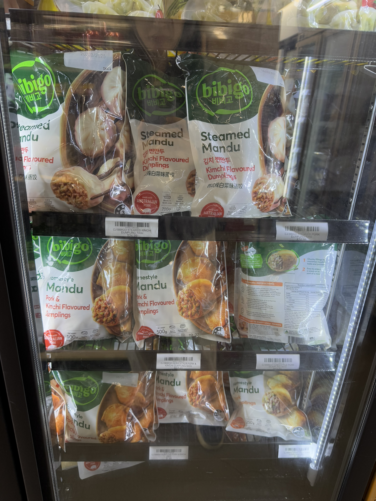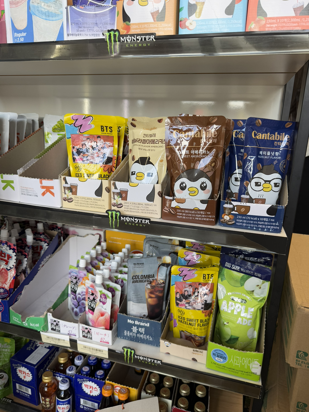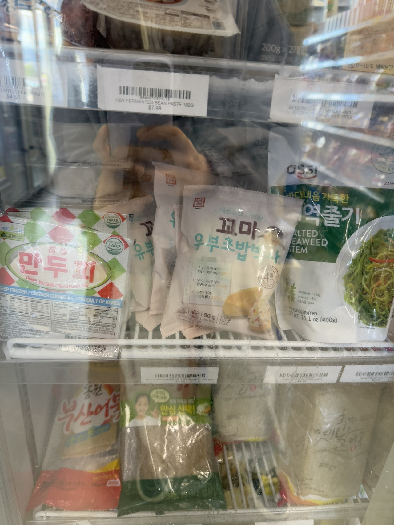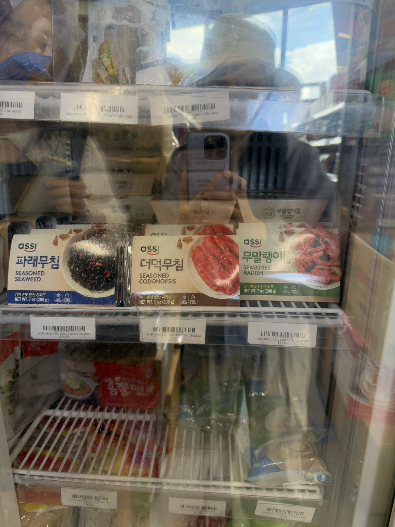 한인 마트. 우) 편의점에서 파는 봉지 커피가 있어서 놀랐다. 우) 파래무침, 더덕무침 등 반찬류도 팔고 있군. 좌) 비비고 만두. 우) 만두피. 만두피까지 팔 줄이야.