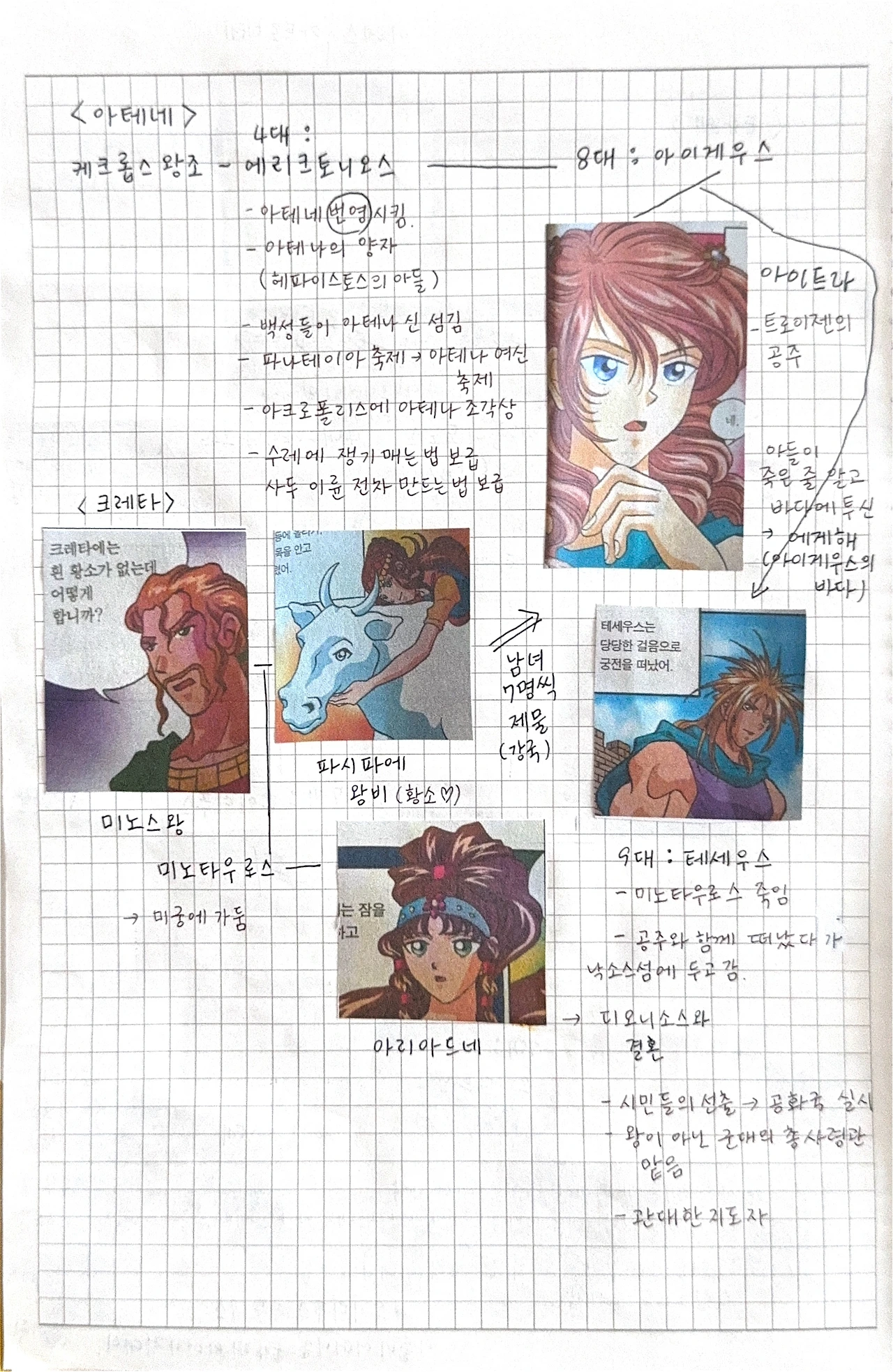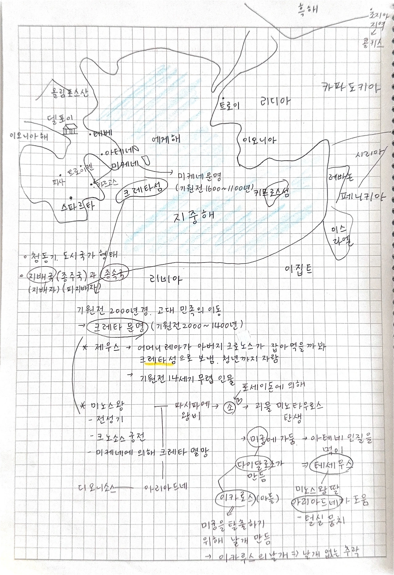 책을 허투루 읽는 느낌이 들면서 책의 내용을 공책에 적기 시작했다. 그리스 로마 신화는 말 그대로 신들의 이야기이니 실제로 있던 일은 아닐 것이다. 처음에는 신화 이야기의 흐름을 파악하기 위해 공책에 적기 시작했지만, 점점 흥미로웠던 건 책에서 추정하는 역사적 배경과 해석이었다. 신화 속 세계와 실제 역사로 추정되는 부분들이 재밌었다.